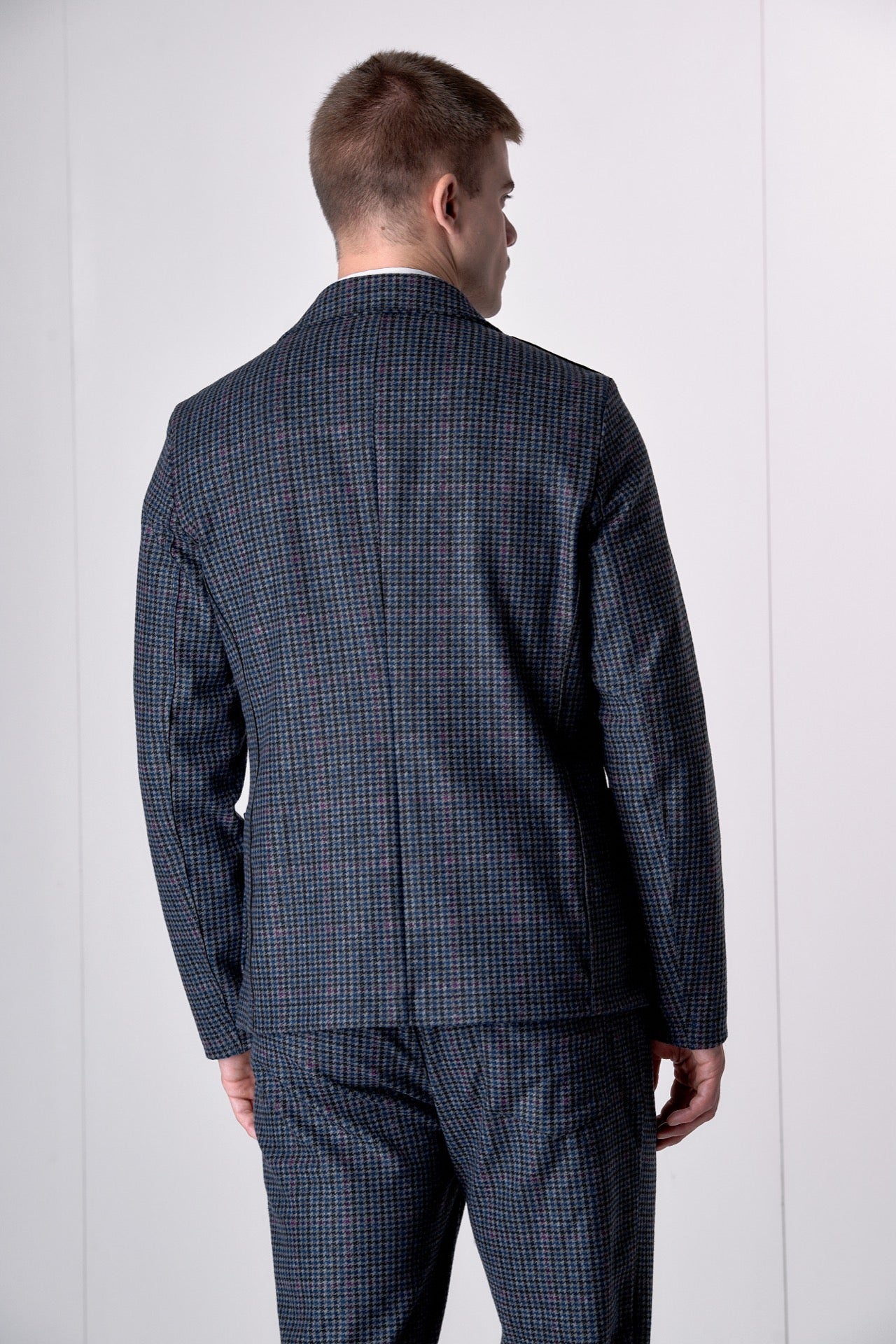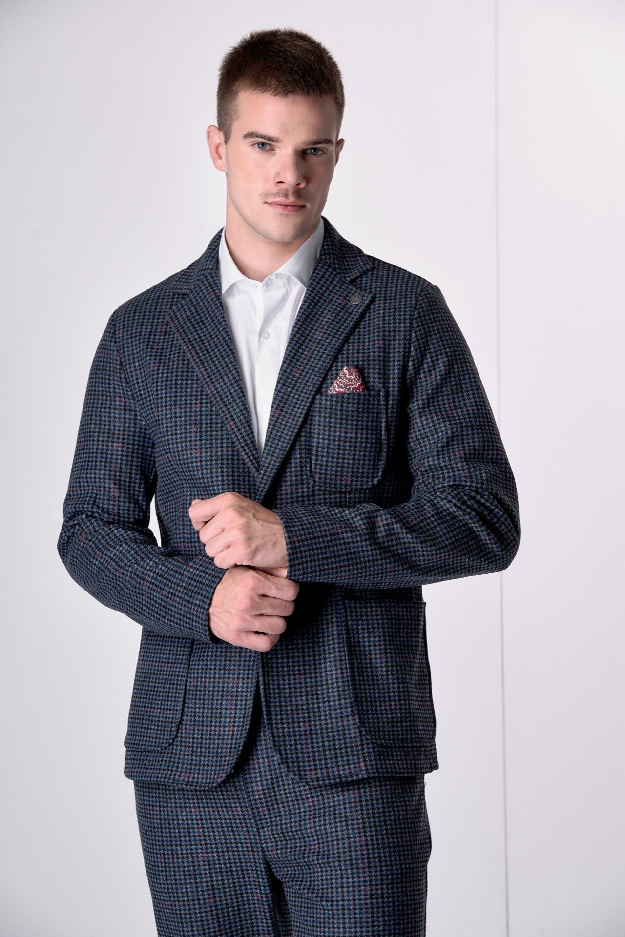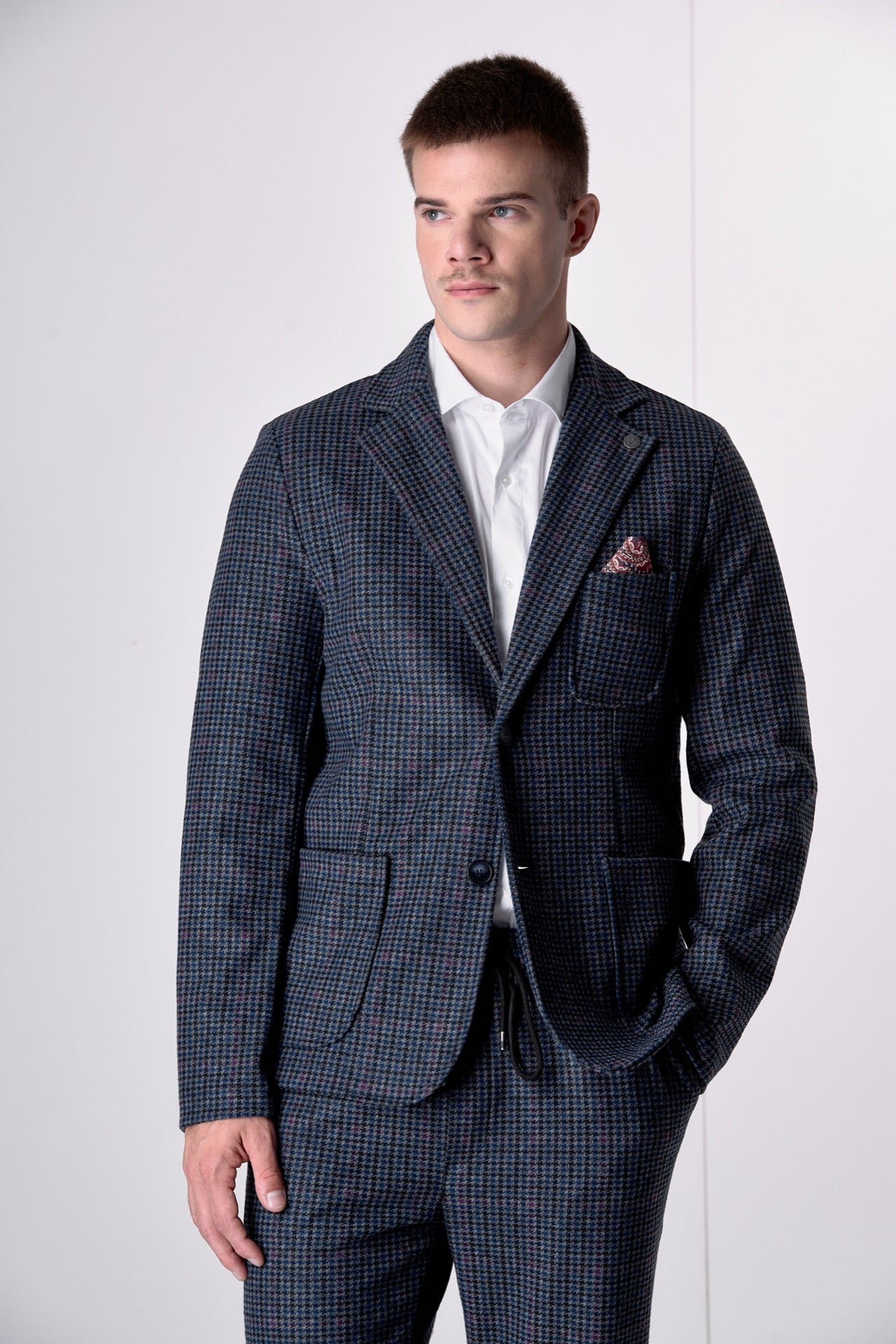 Giacca Monopetto Sartoriale Pied de Poule Blu e Bordeaux con interni e pochette in tessuto V2