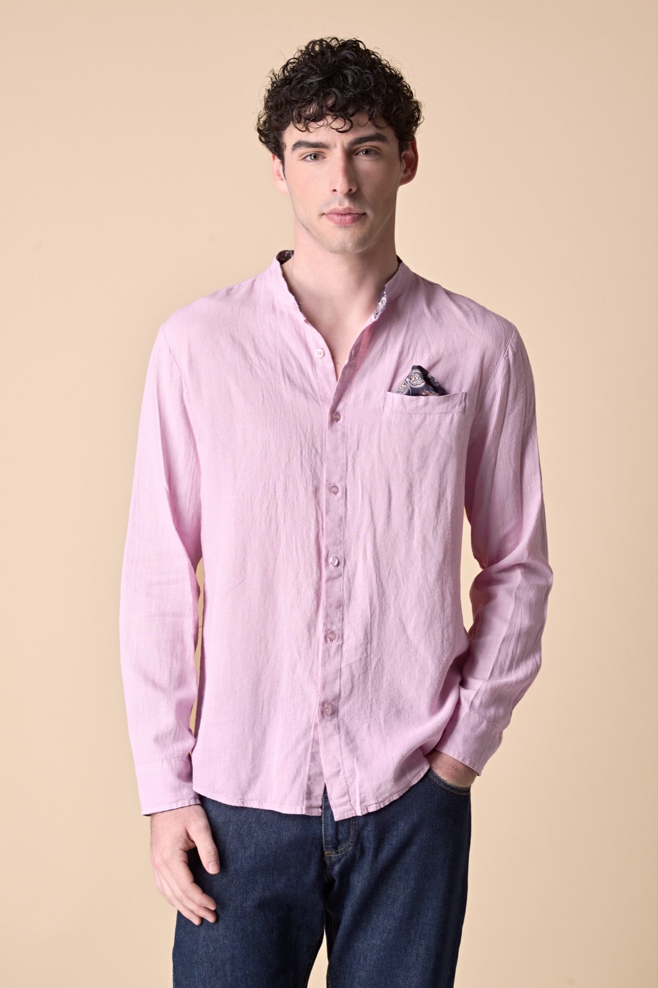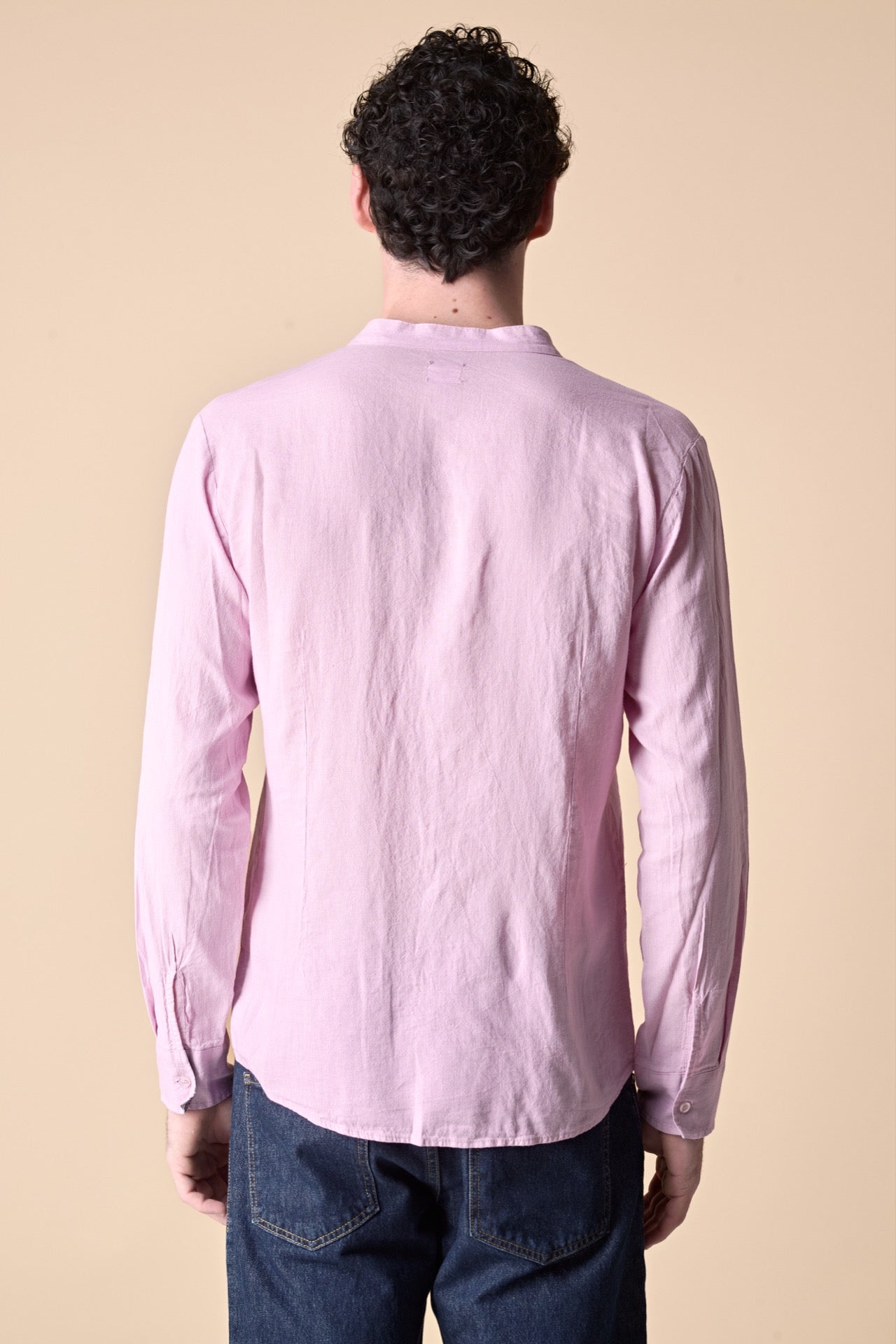 Camicia Coreana in lino tinto capo Rosa Cipria con pochette e dettagli in tessuto V2