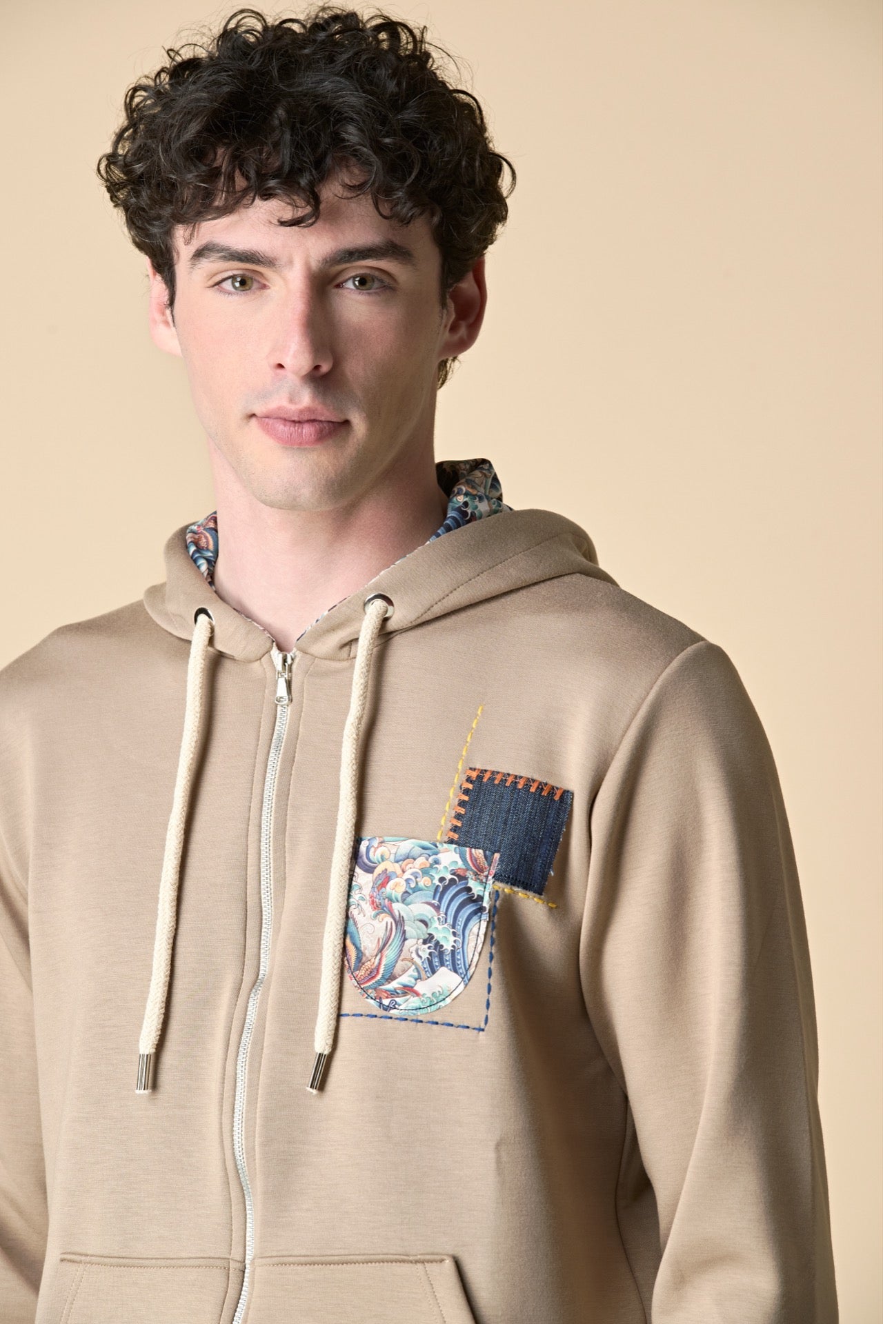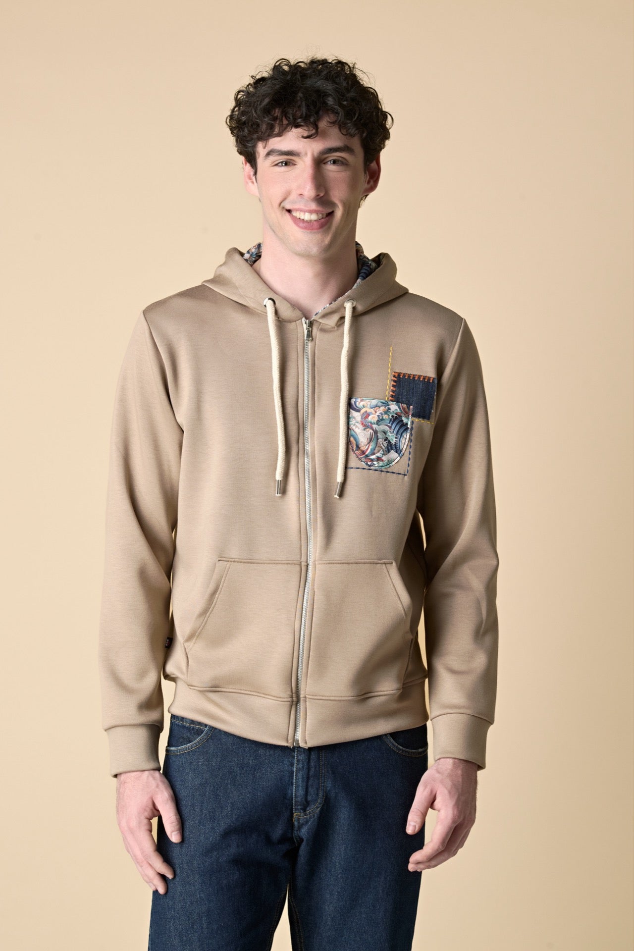 Felpa cappuccio e zip Sabbia con Taschino e Patch in tessuto V2