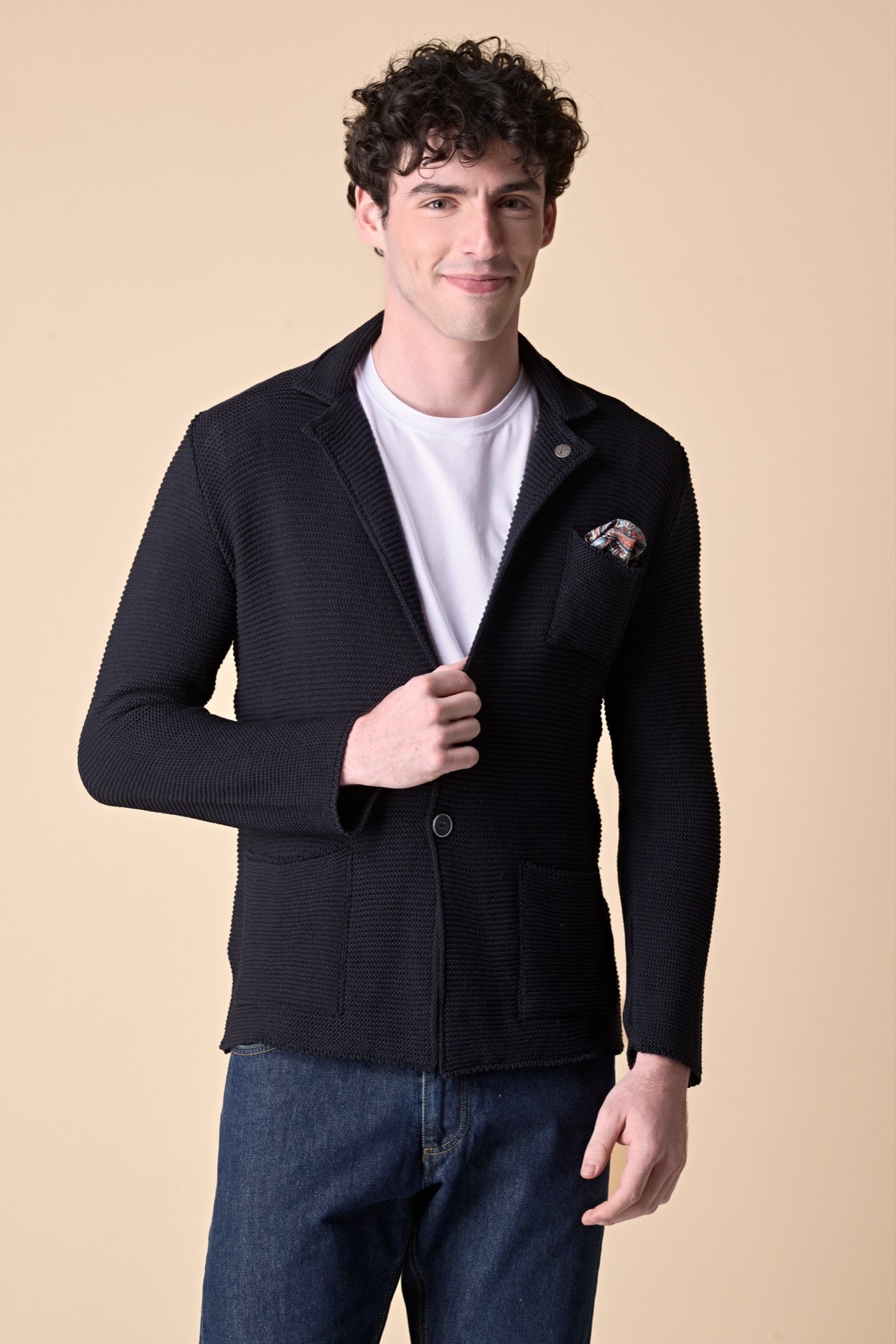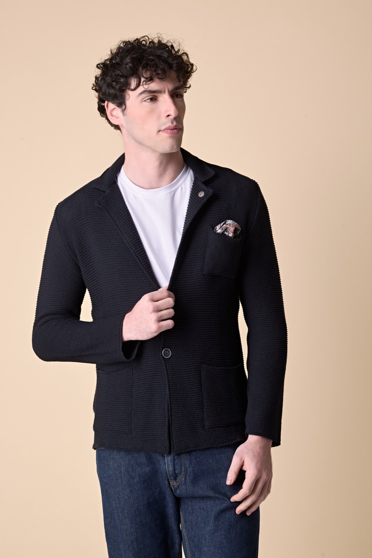 Un simbolo dell'universo V2: la massima espressione di stile, all'insegna della sartorialità Made in Italy. La giacca monopetto con interno collo e pochette in tessuto V2 è perfetta da abbinare a qualsiasi look.