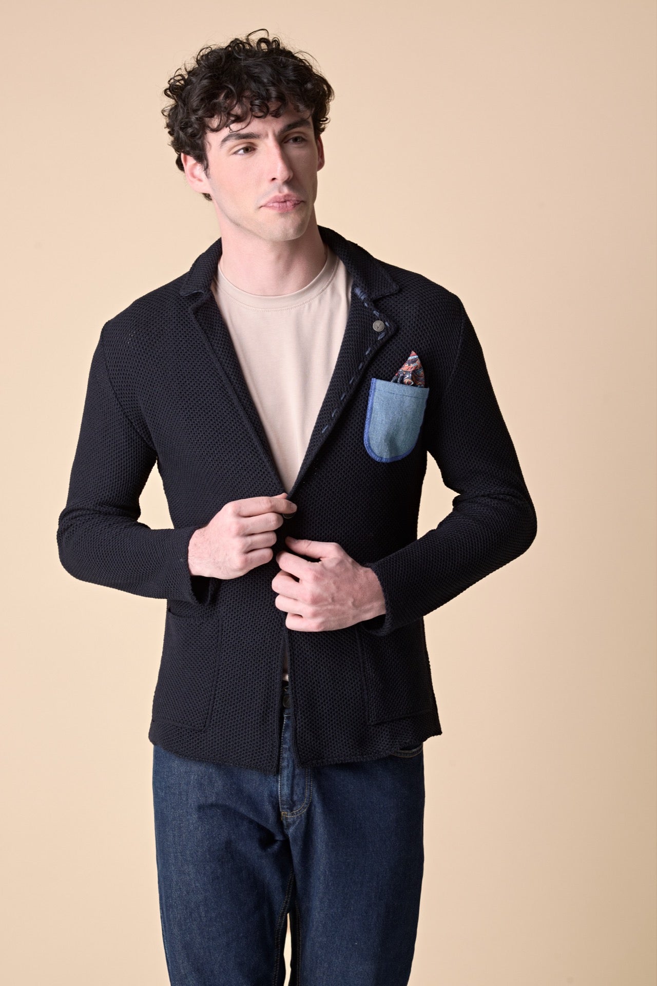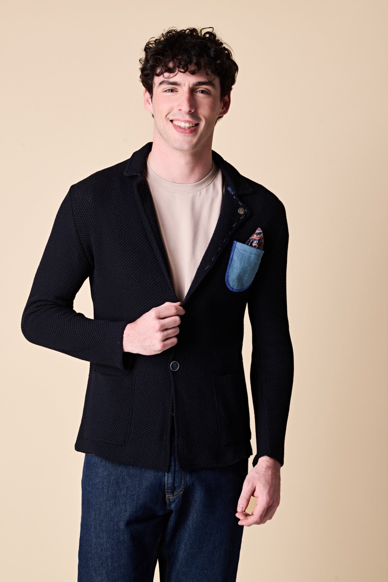 Giacca Monopetto Premium Occhio di Pernice, con Pochette in tessuto V2, taschino in Jeans, sottocollo in tessuto V2 e puntacci ricamati a mano.