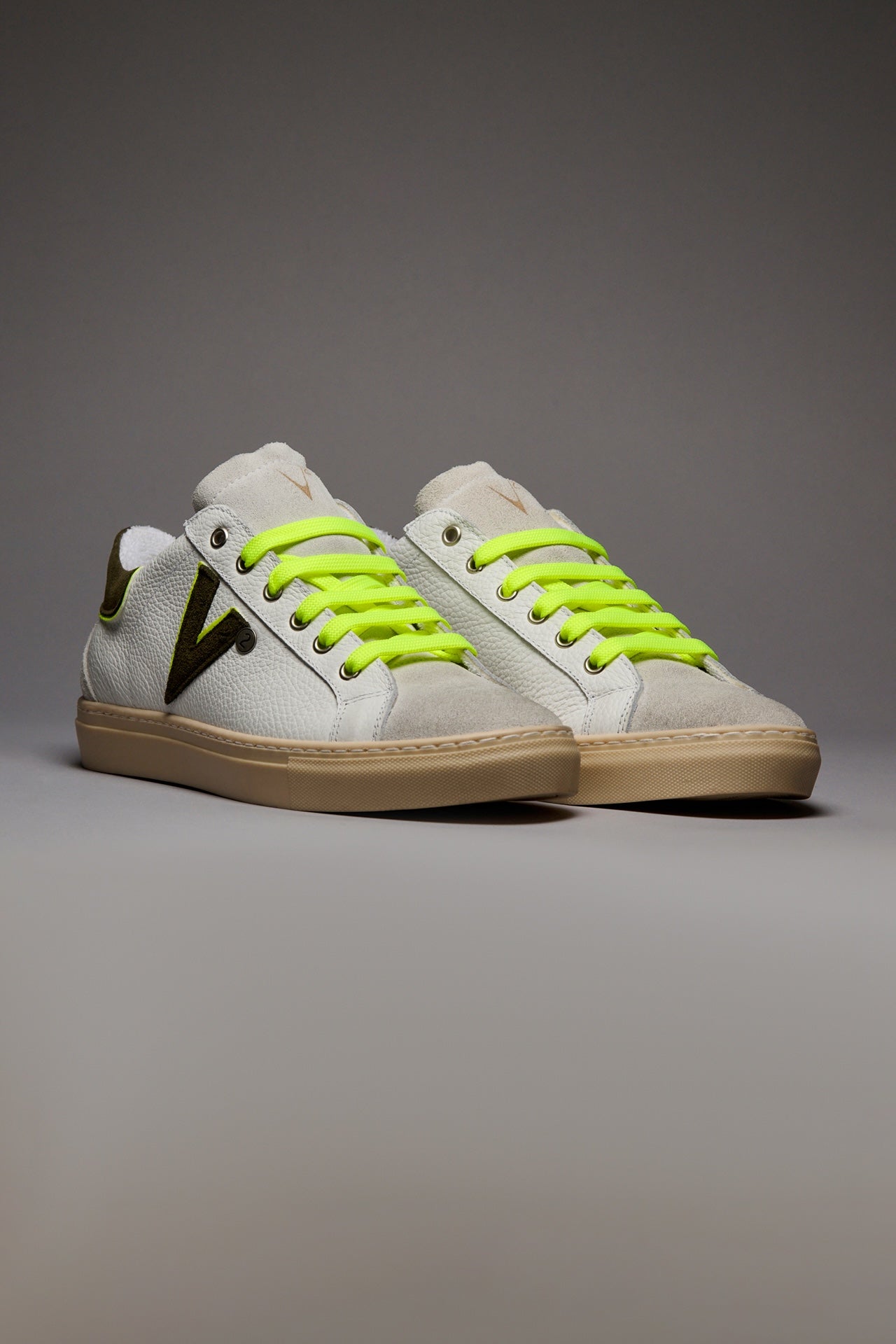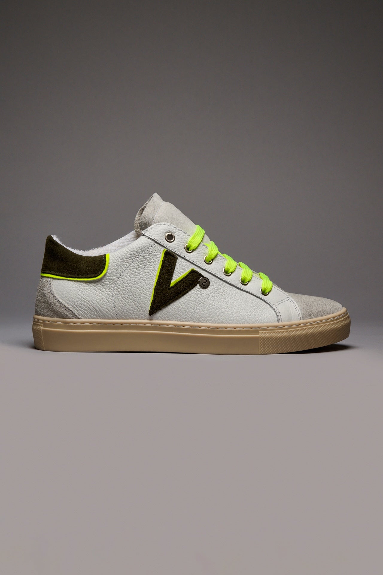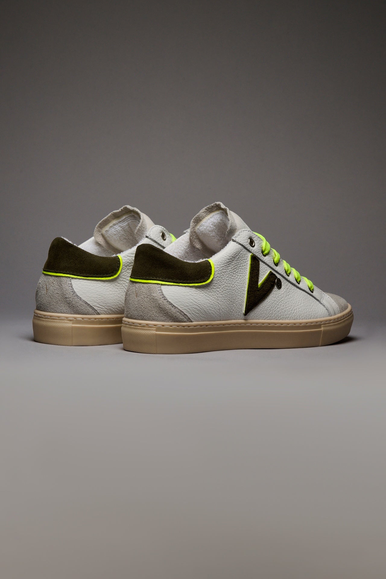 OLYMPIC V - Sneakers a suola bassa in pelle martellata con inserto e retro Bicolor Verde Militare e Giallo Fluo