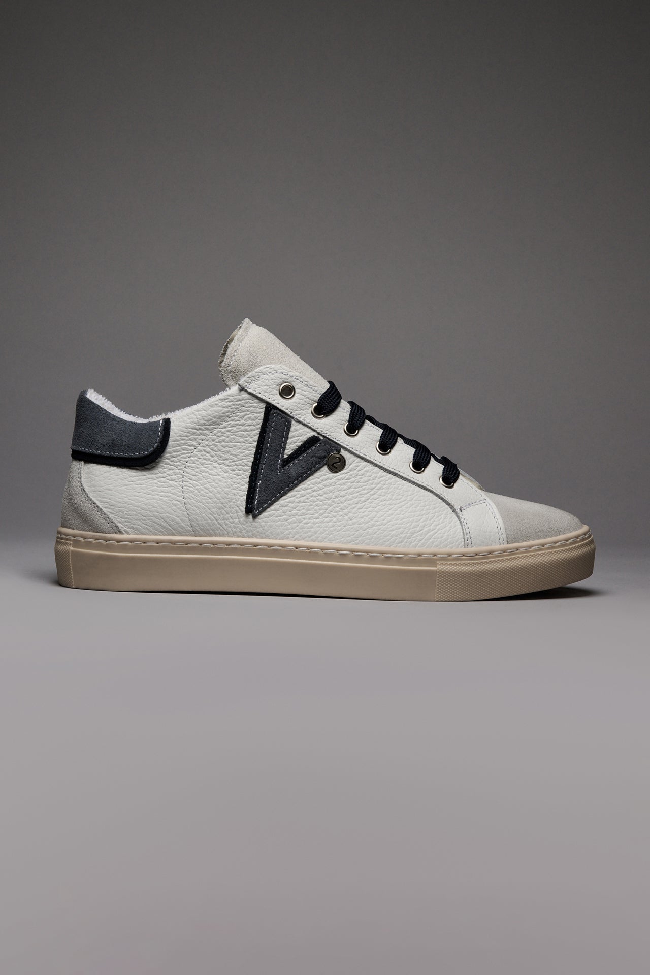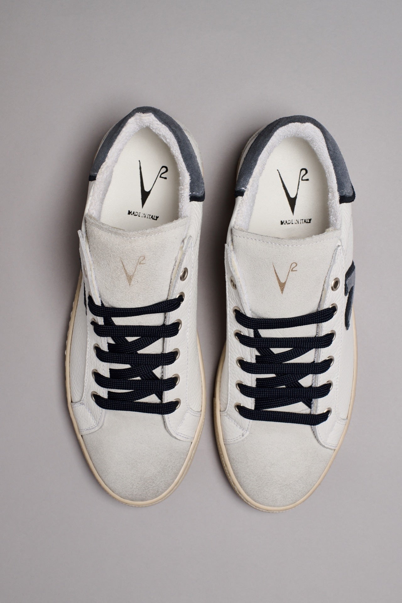 Retro bicolor in pelle scamosciata, doppio inserto laterale bicolor e lacci a contrasto: una scarpa originale, colorata e spensierata.