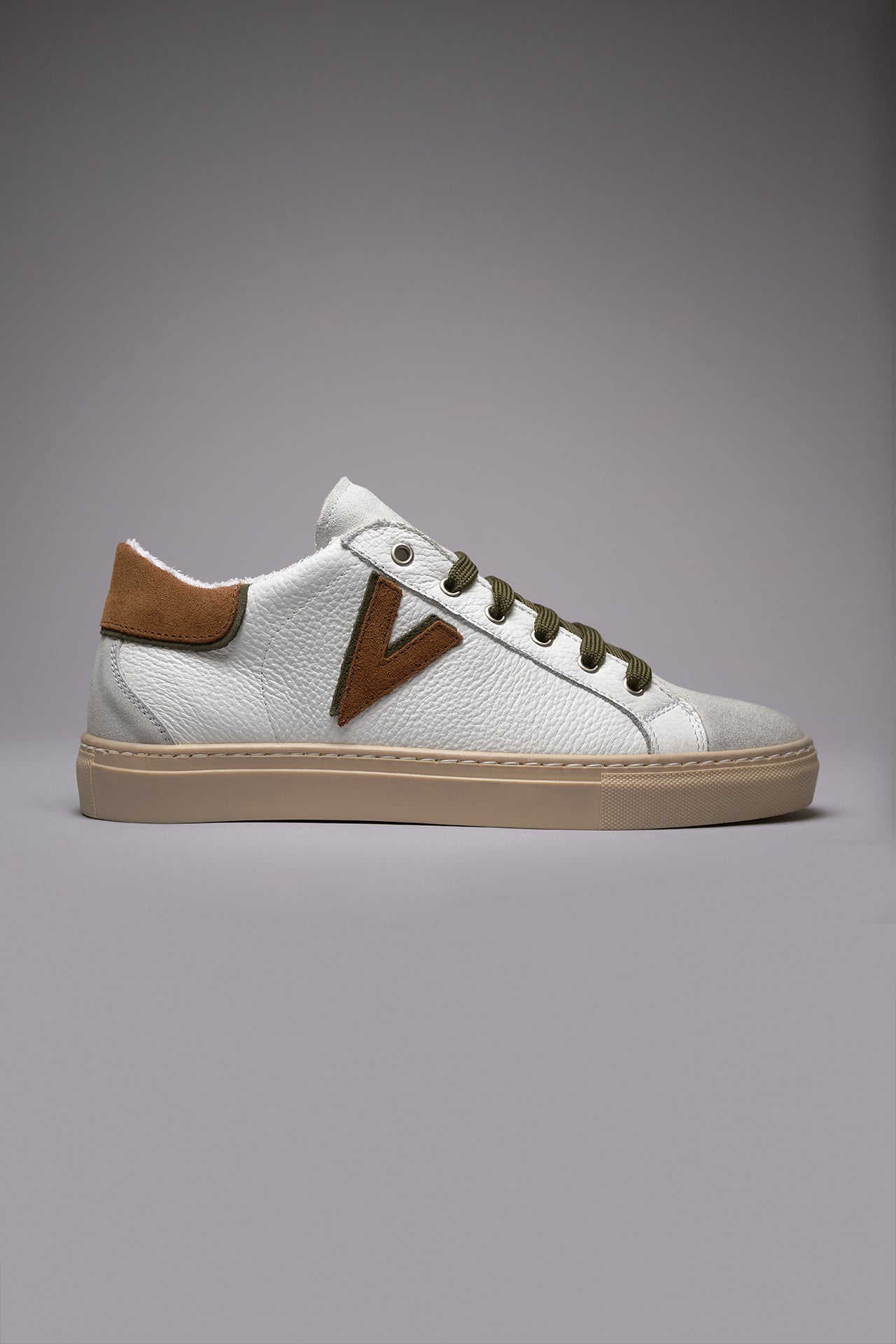 OLYMPIC V - Sneakers a suola bassa in pelle martellata con inserto e retro Bicolor Cuoio e Verde Militare