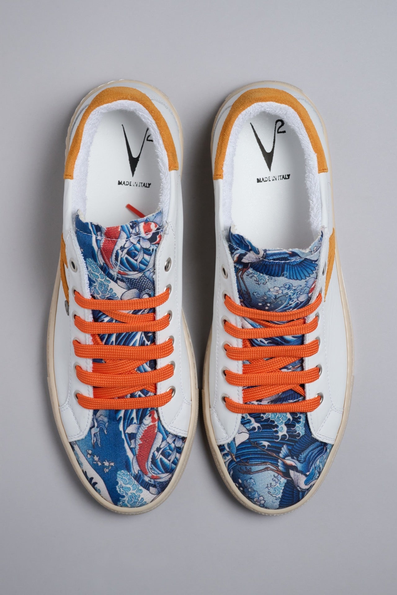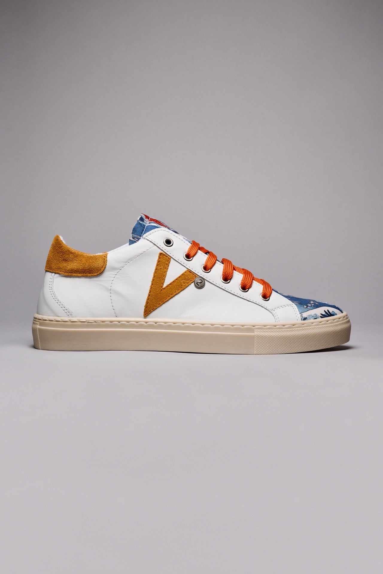 OLYMPIC - Sneakers a suola bassa in pelle Bianca retro e inserto Arancio con linguetta in tessuto Japan Waves
