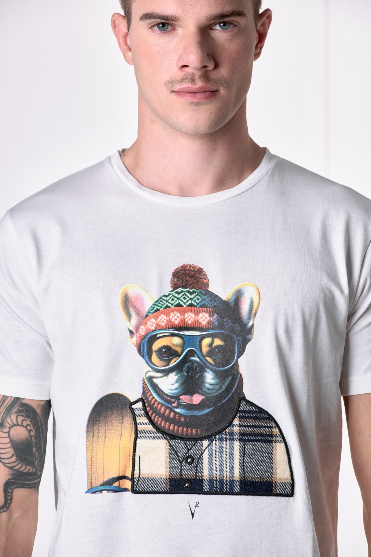 T-Shirt Panna con stampa Bulldog e ricamo in tessuto V2