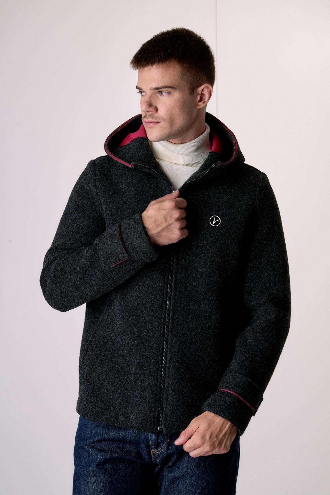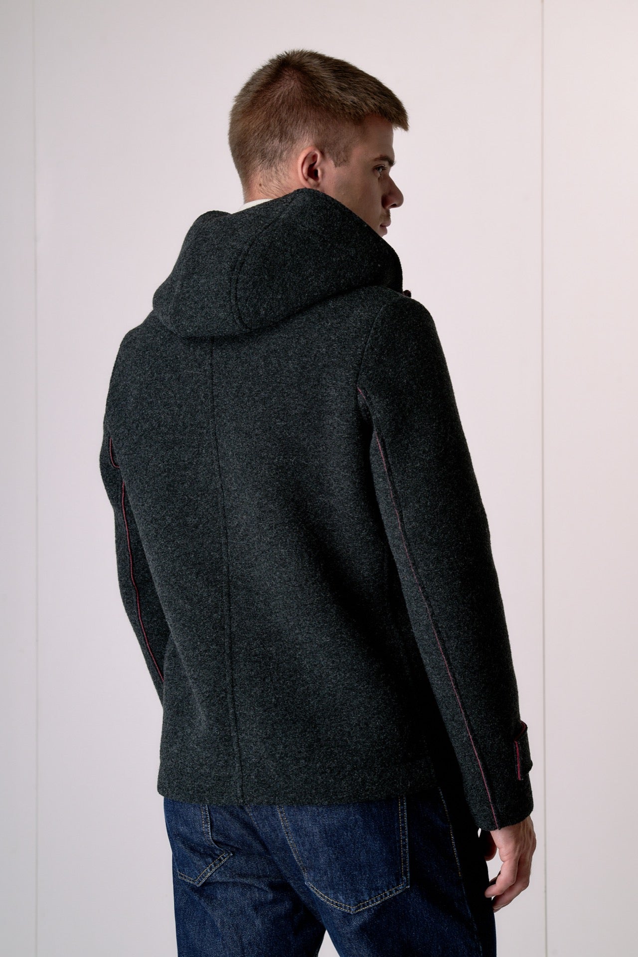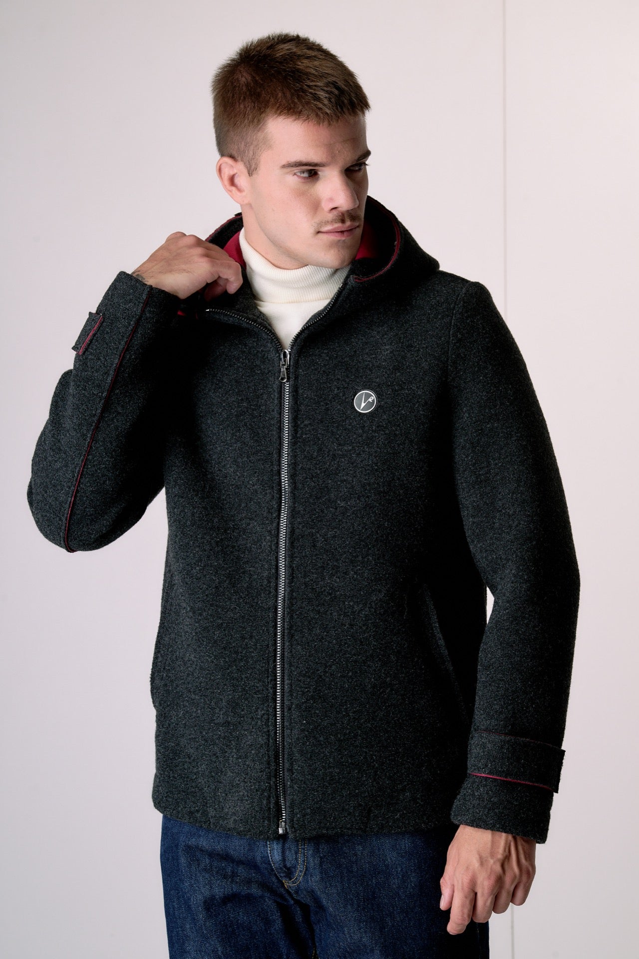 Anthracite bonded boiled wool bomber jacket with hood