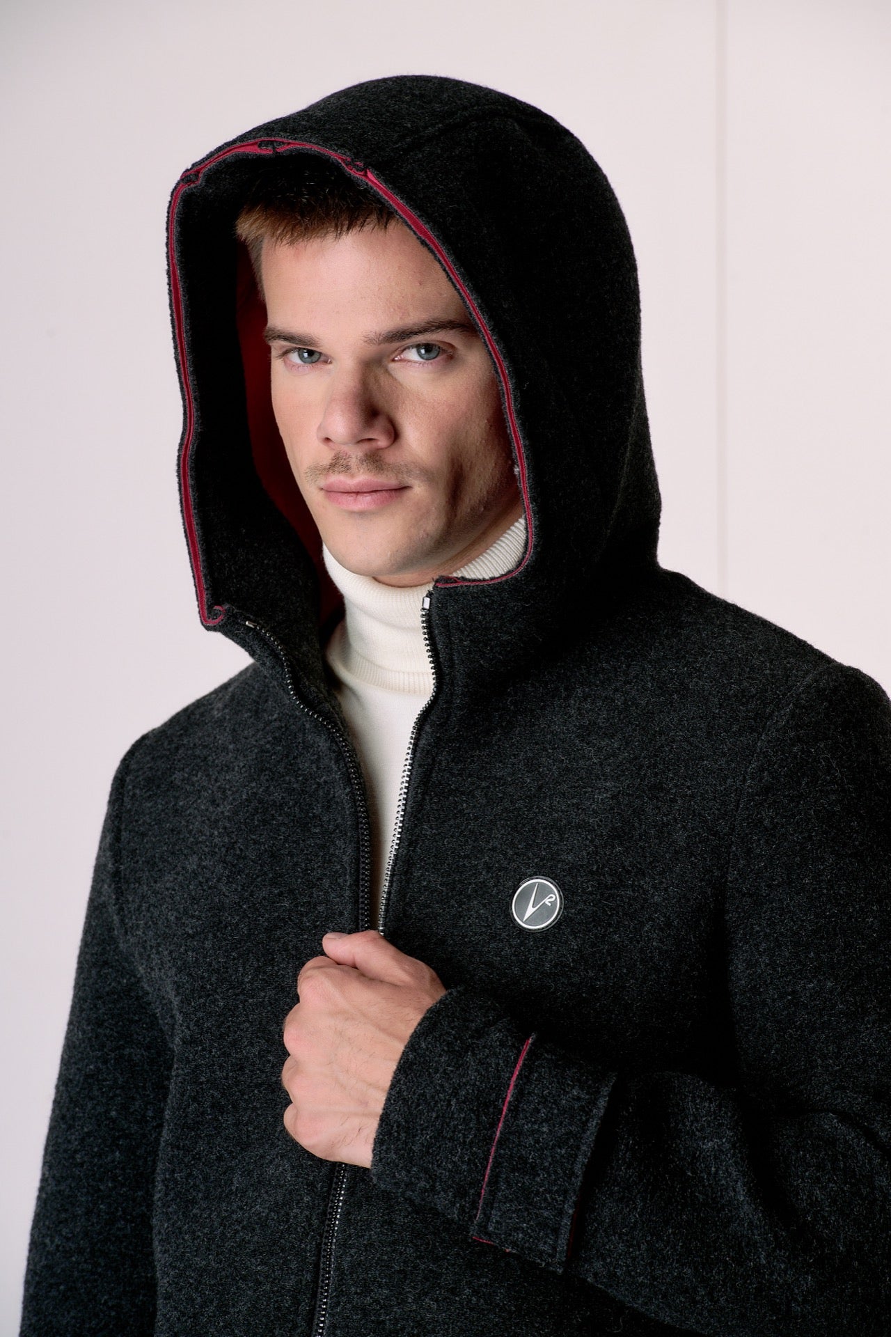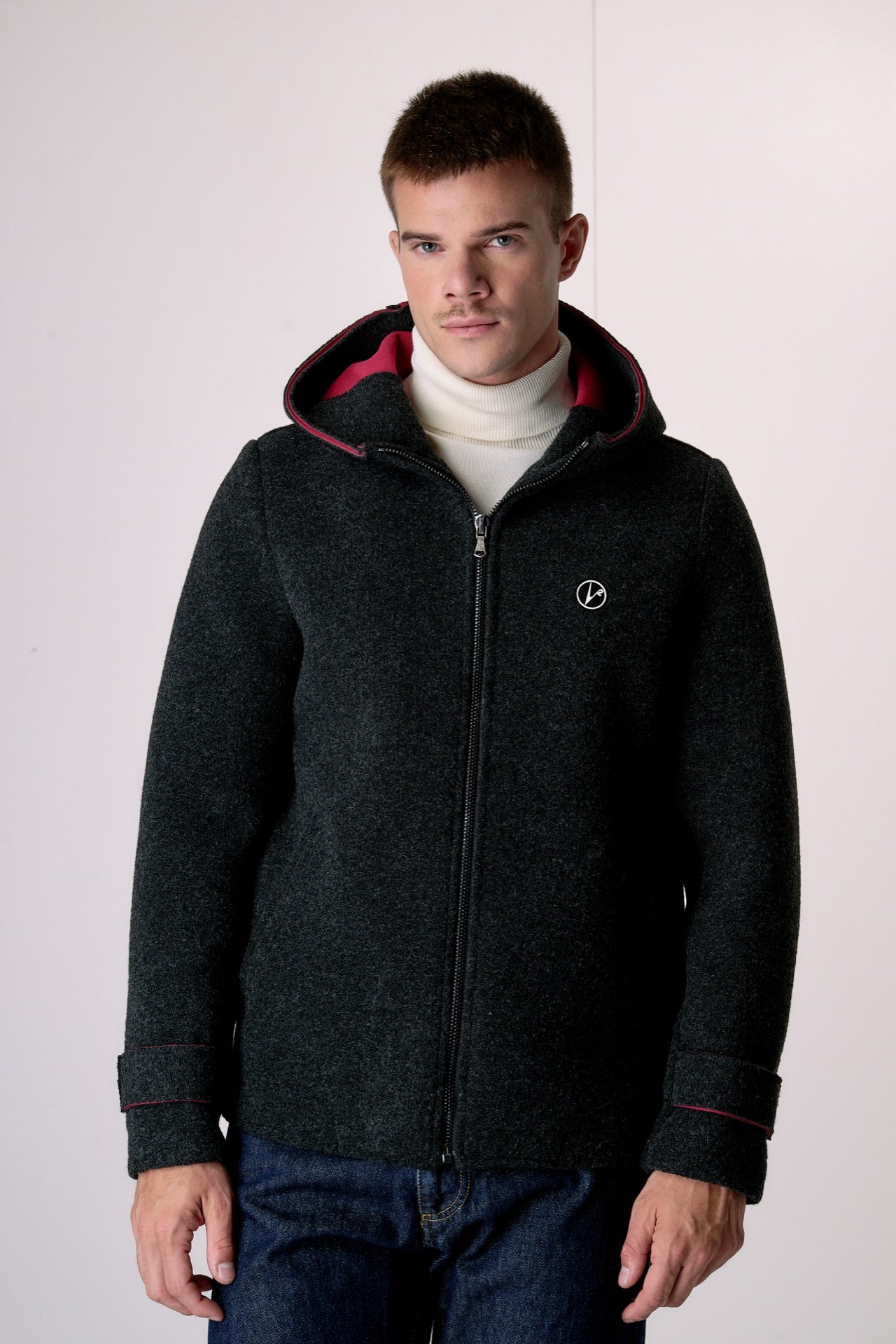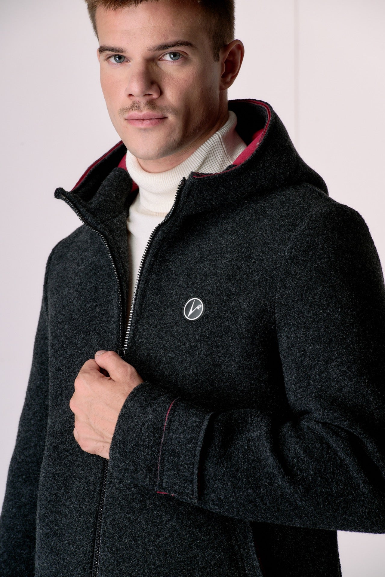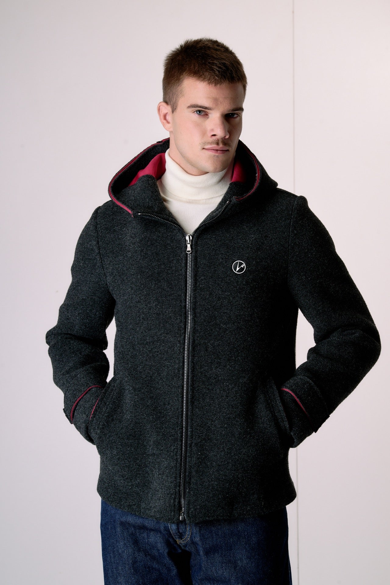 Anthracite bonded boiled wool bomber jacket with hood