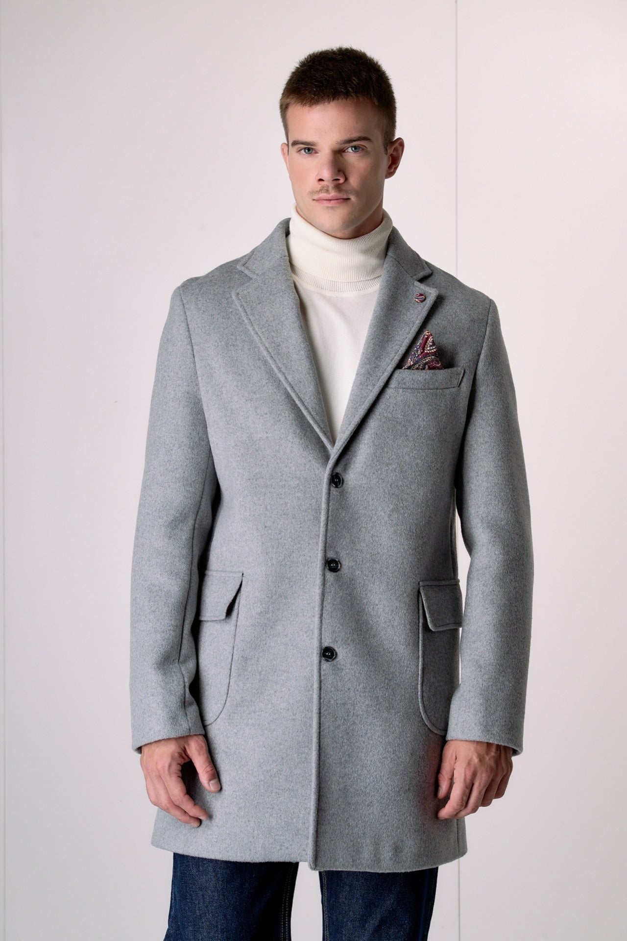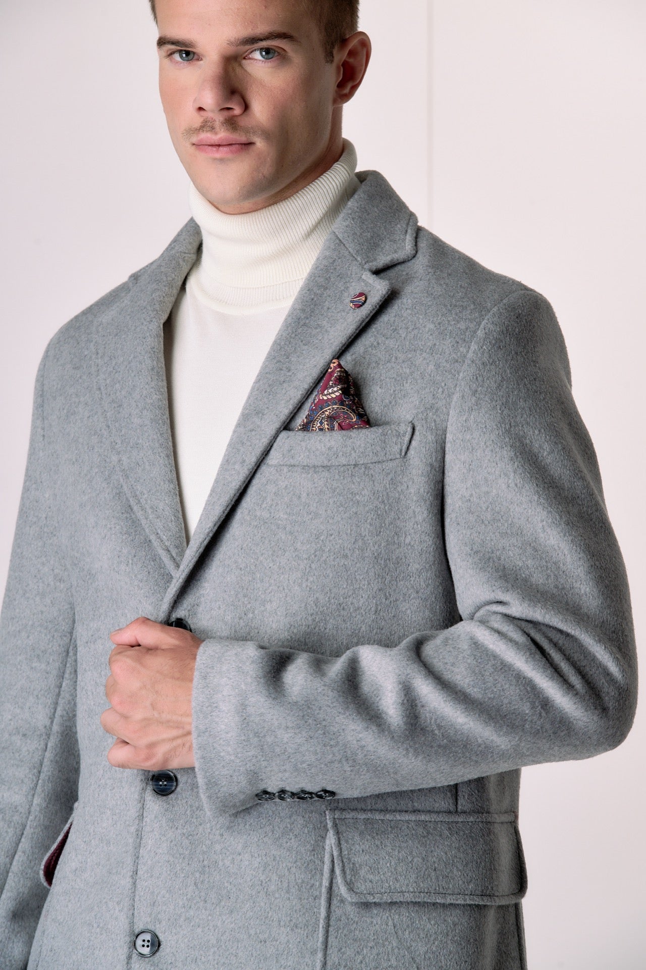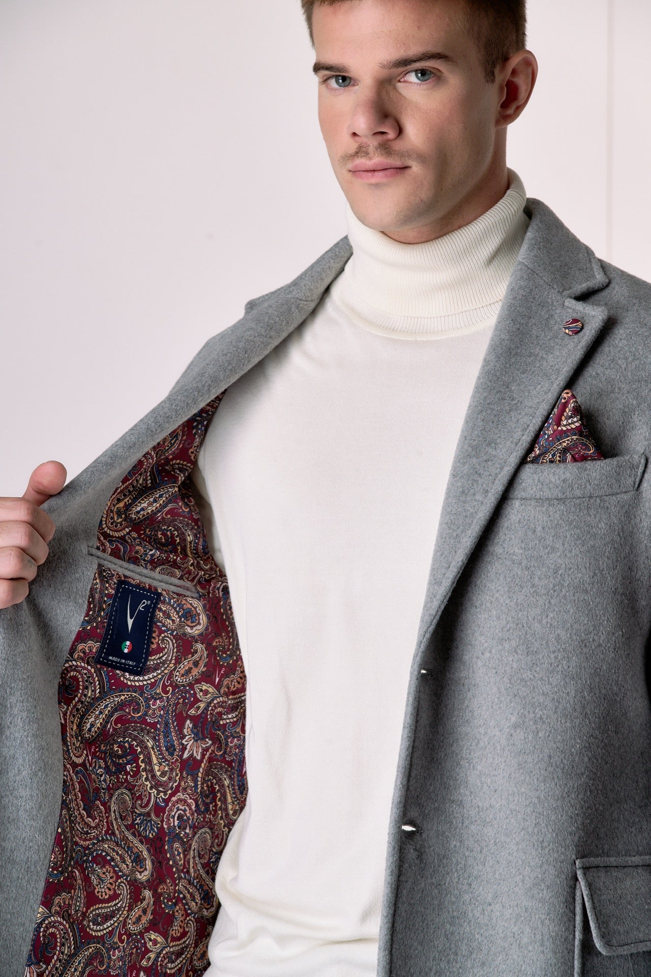 Single-breasted tailored coat in grey wool with pocket square and internal lining in V2 fabric