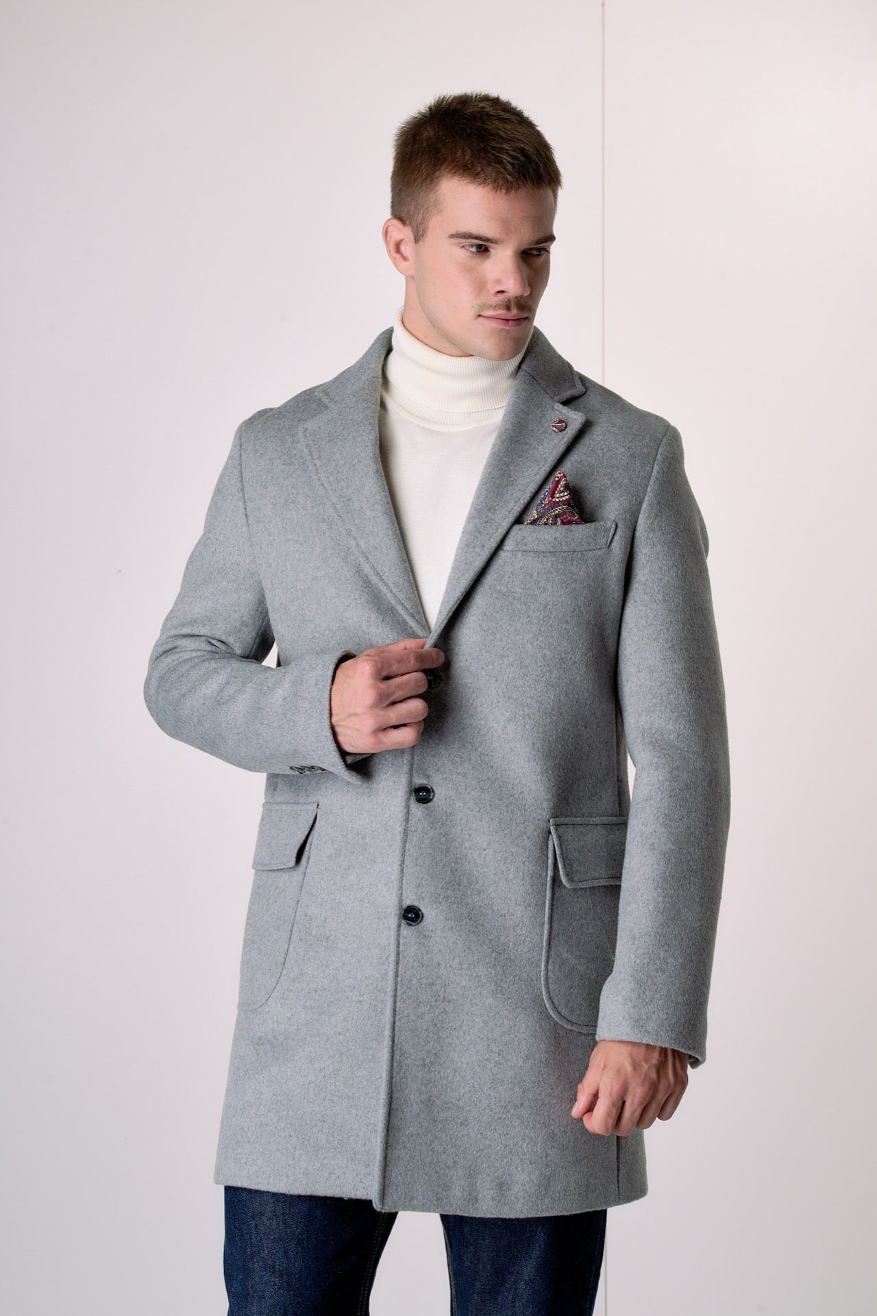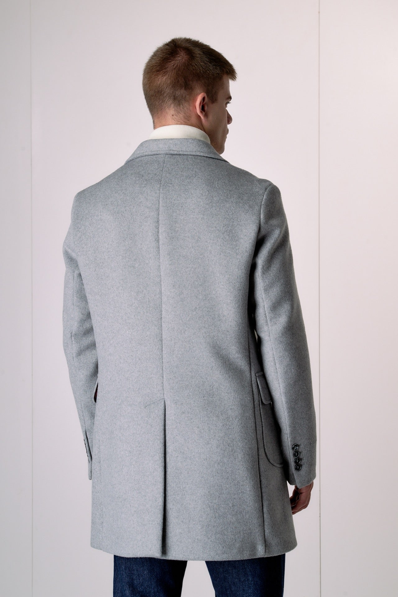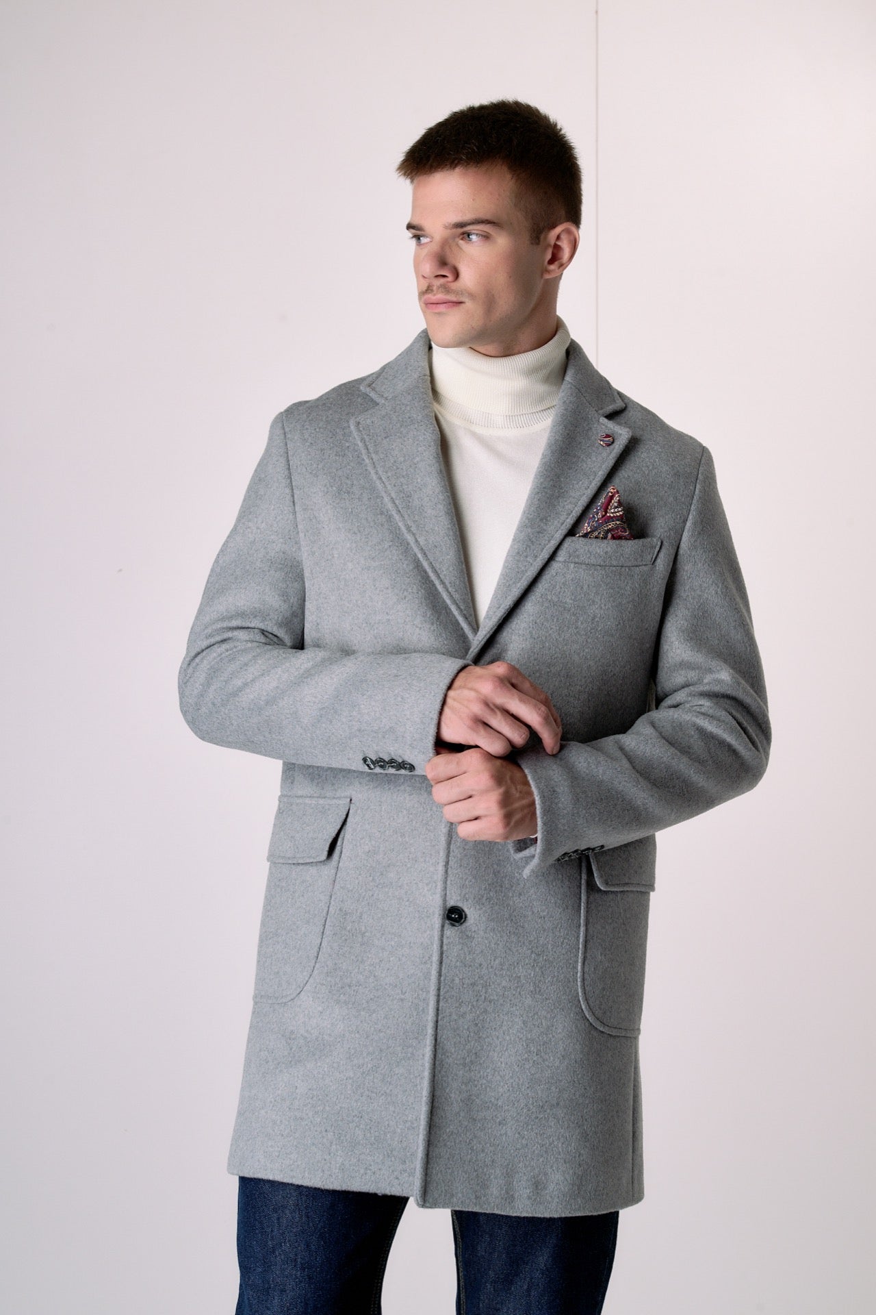 Single-breasted tailored coat in grey wool with pocket square and internal lining in V2 fabric