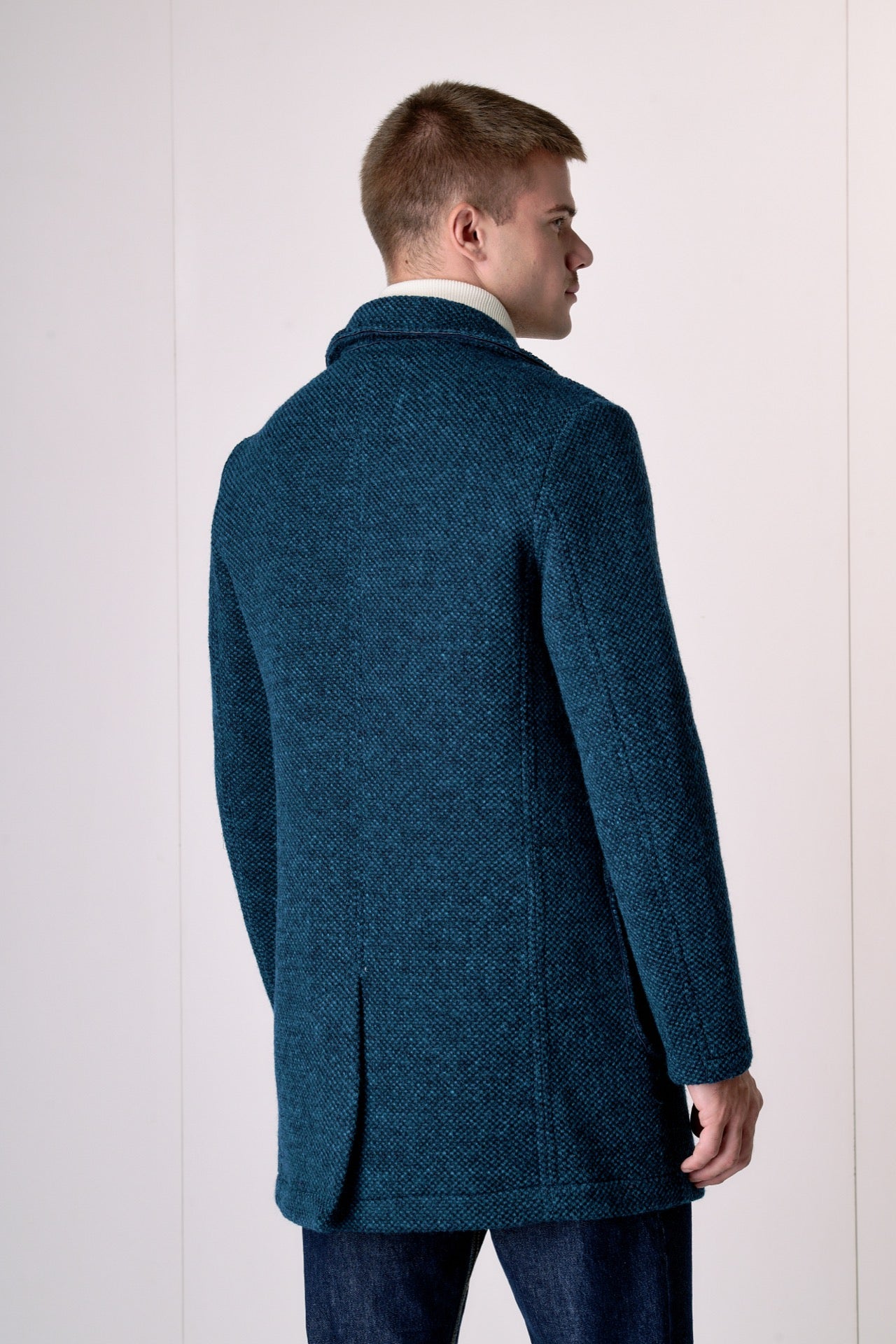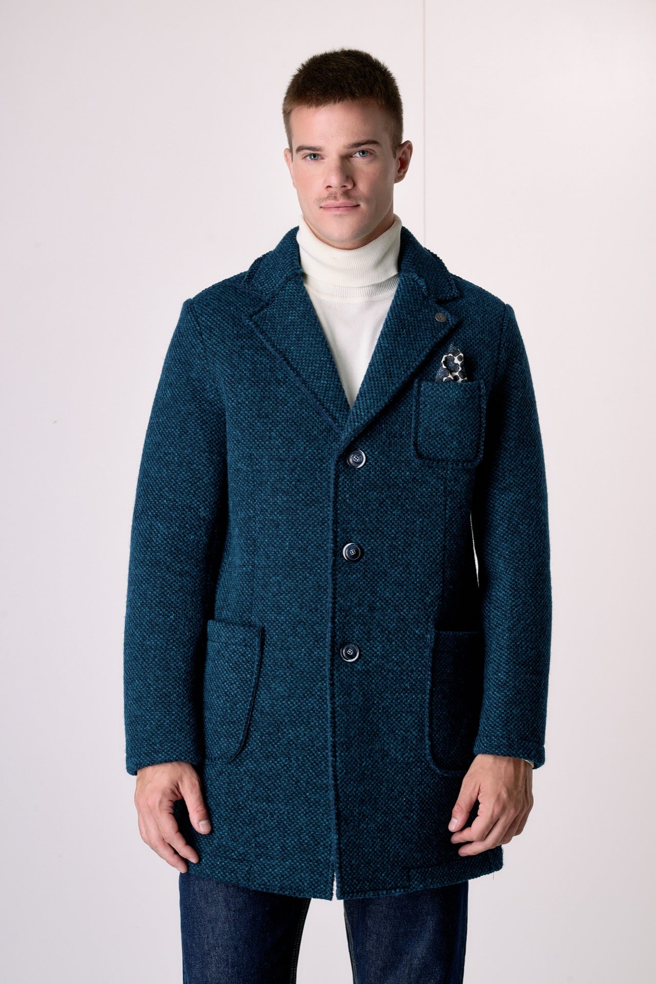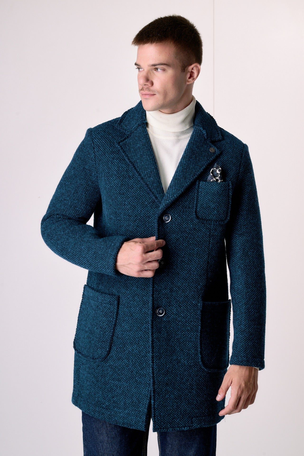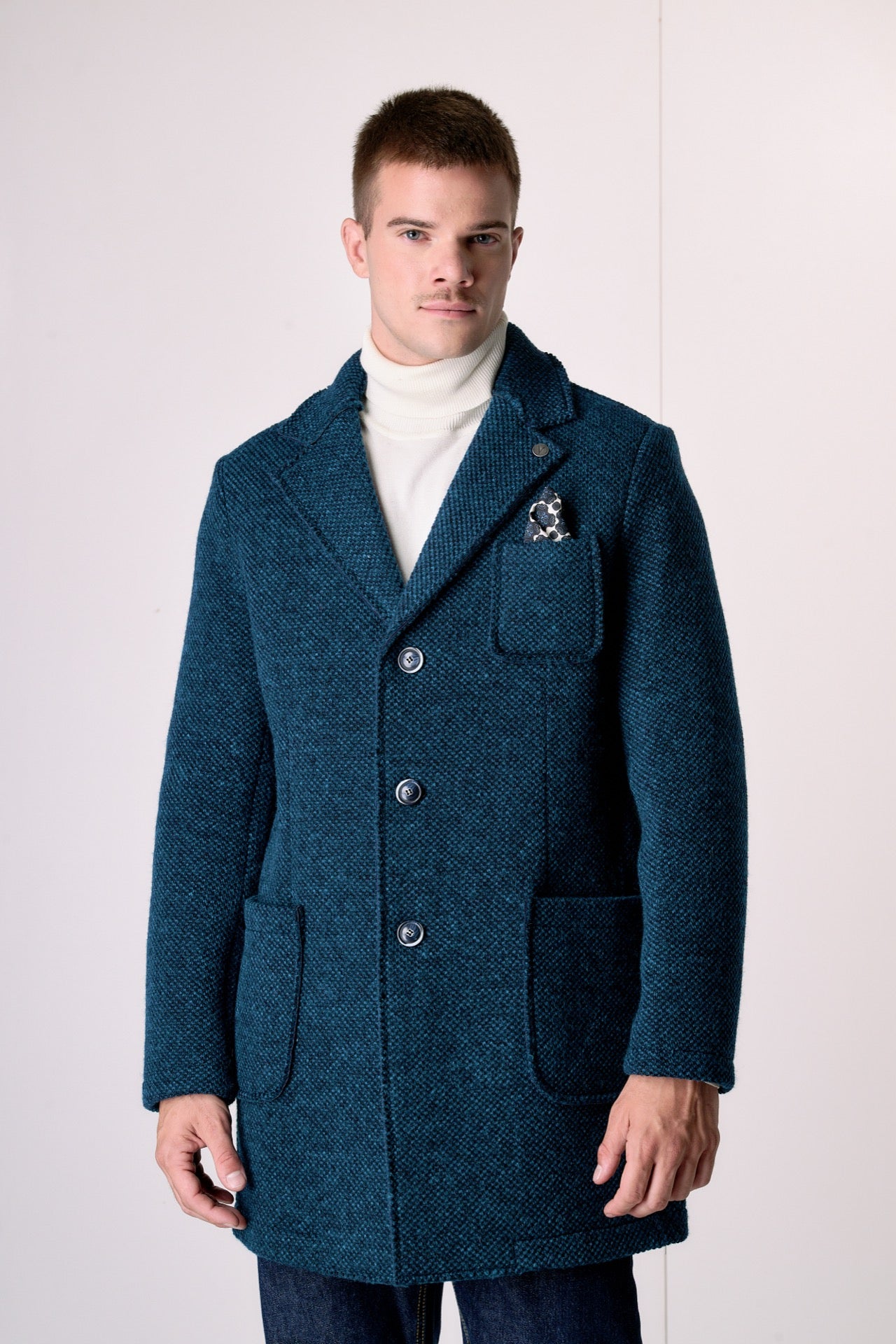 Single-breasted coat in multicolored blue rice stitch coupled with a pocket square in V2 fabric