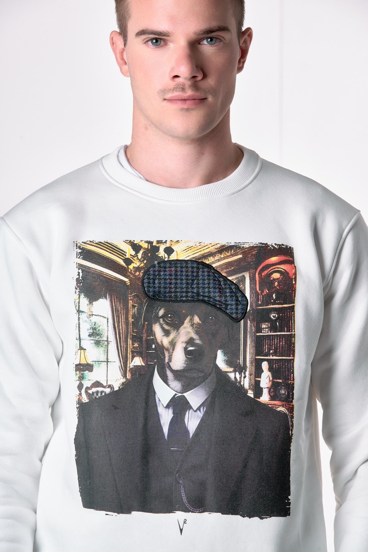 Cream Crewneck Sweatshirt with Doberman Print and Fabric Embroidery V2