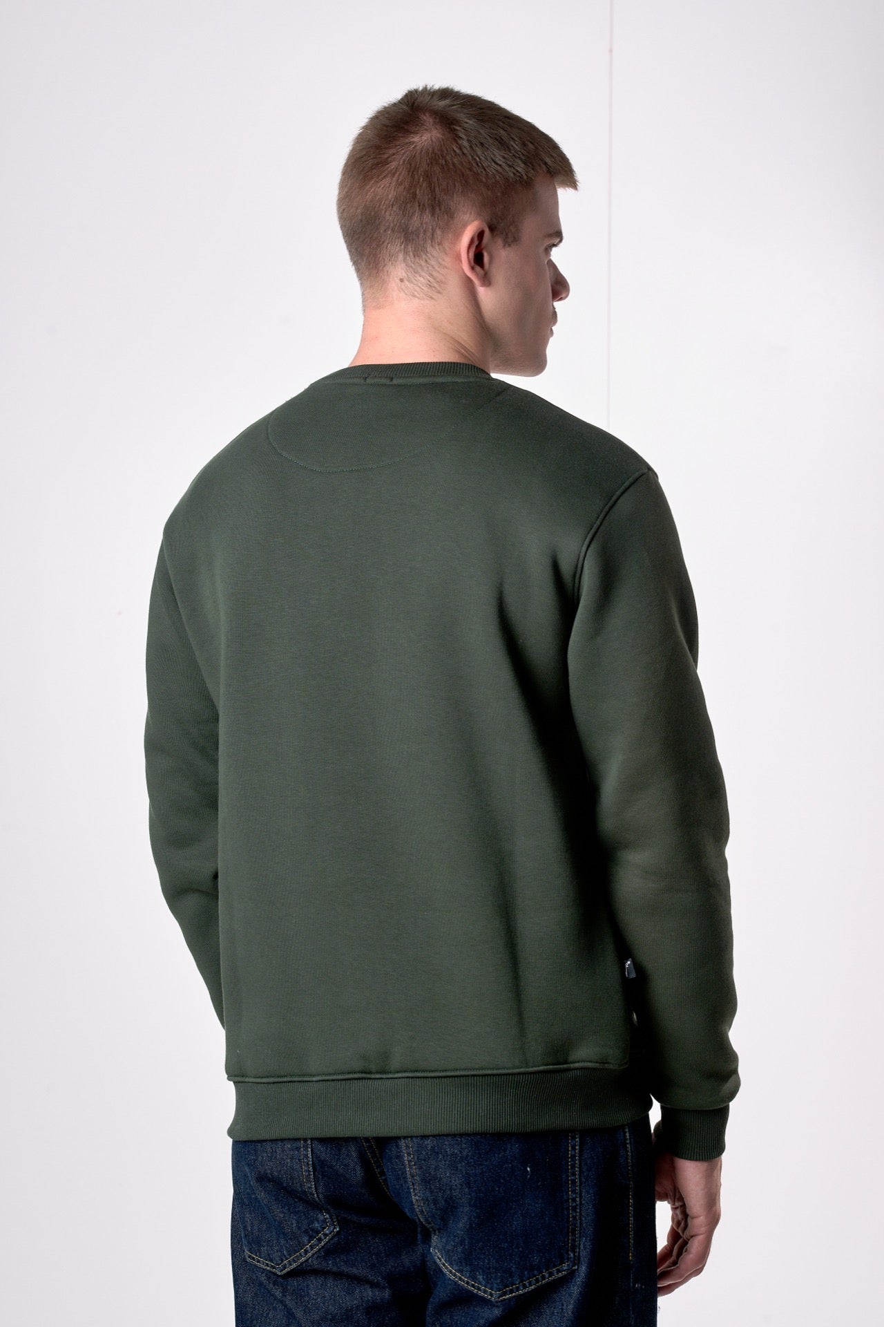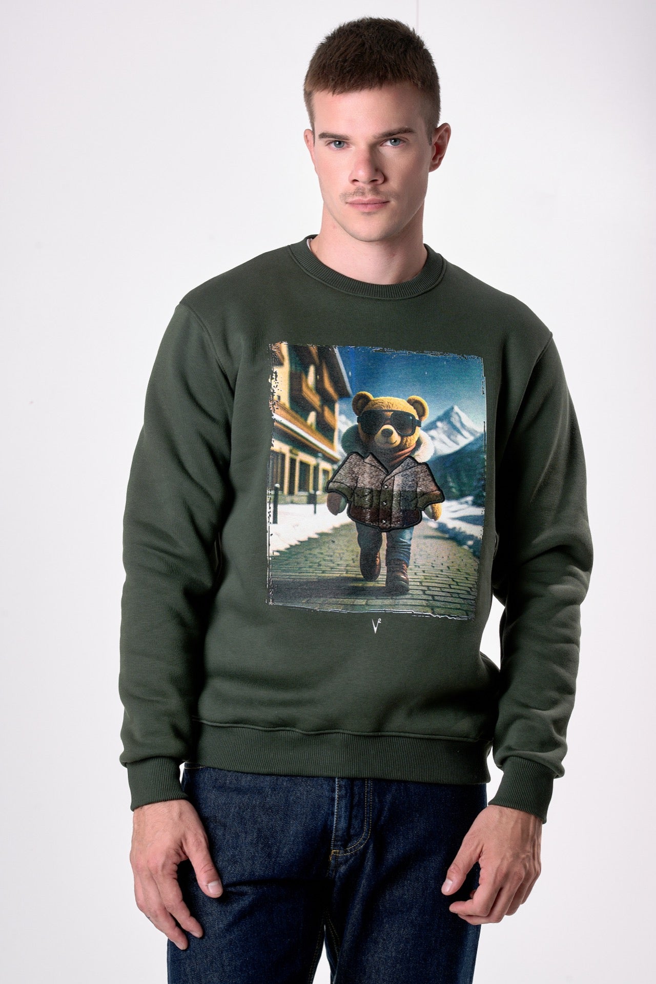 Military Green Crewneck Sweatshirt with Teddy Print and V2 Fabric Embroidery