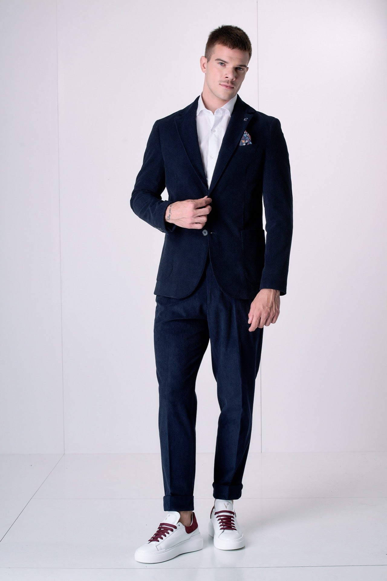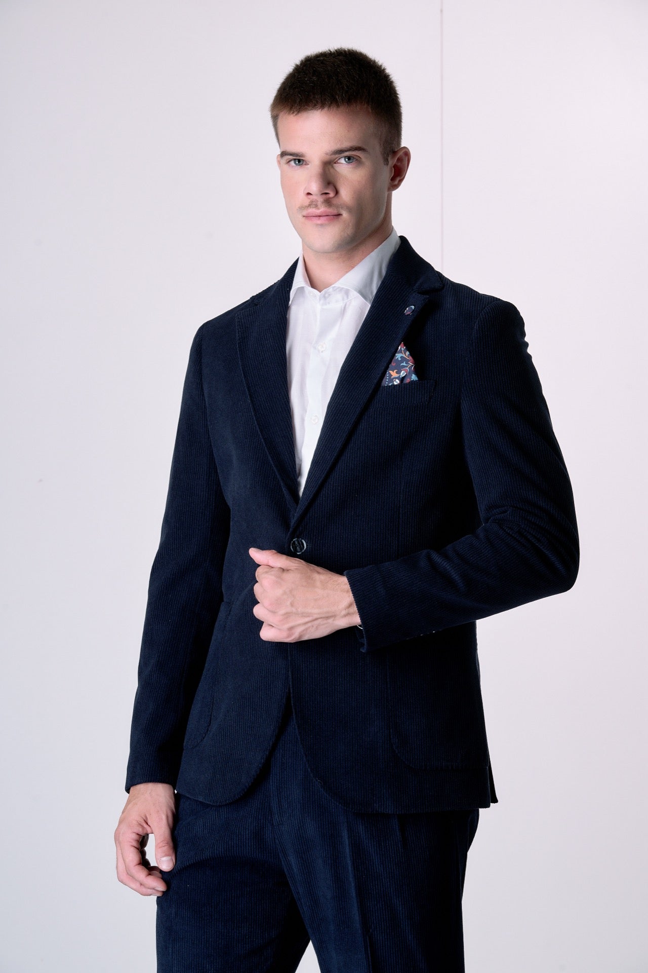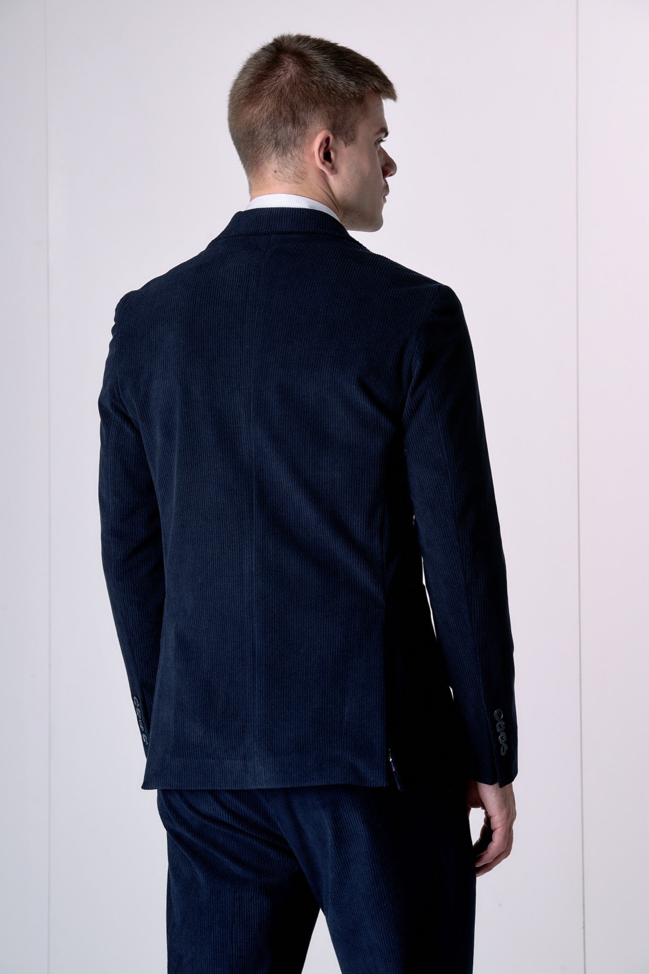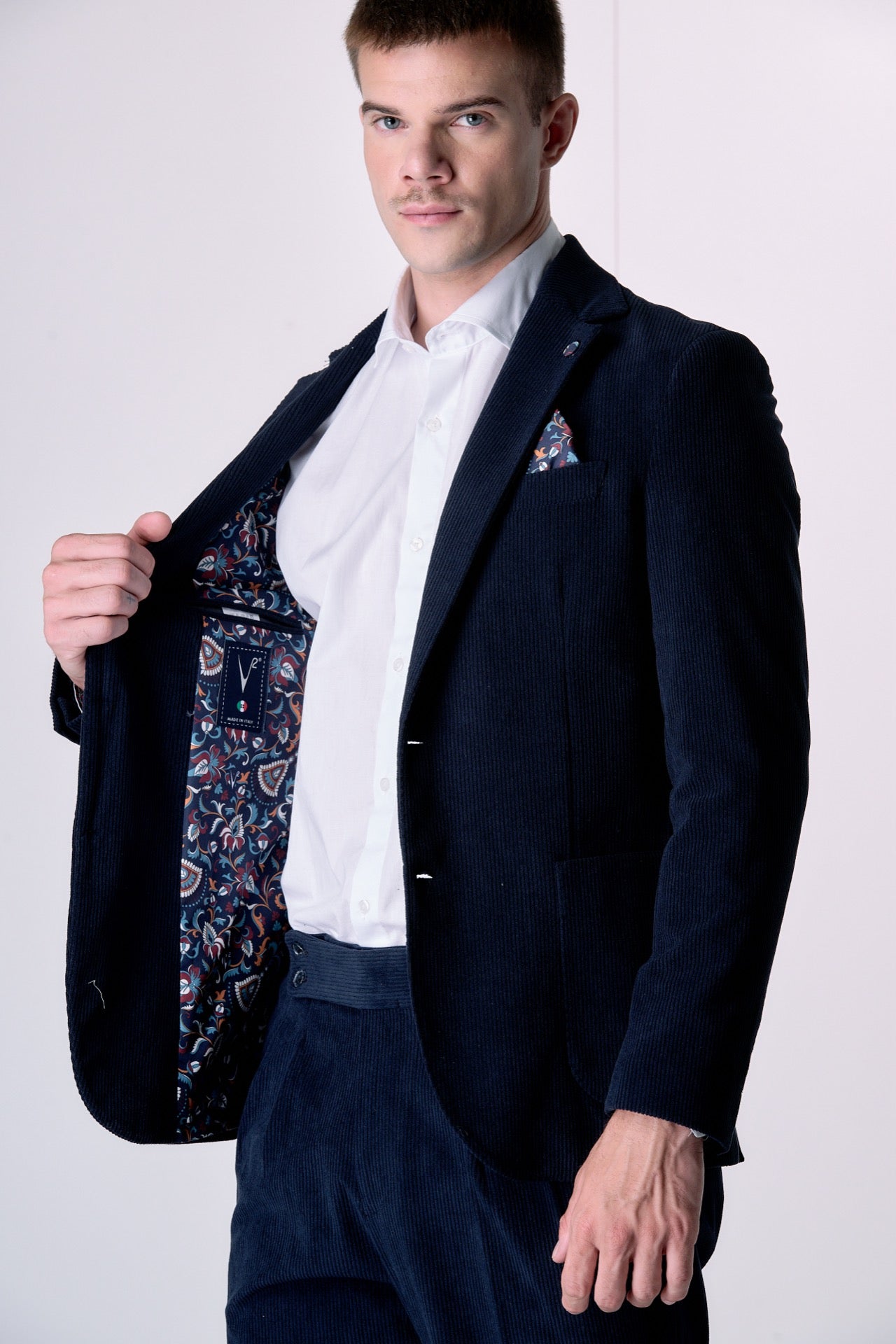 Single-breasted Haute Couture Jacket in Blue Velvet with V2 fabric interior and pocket square