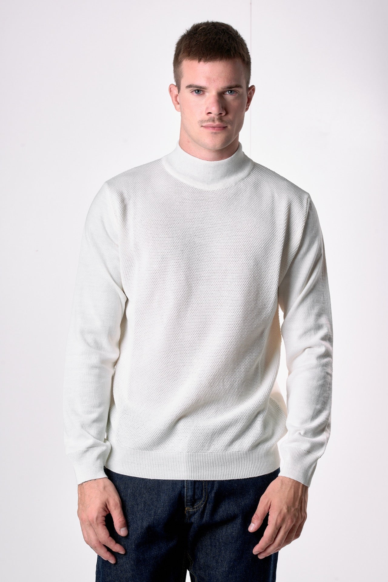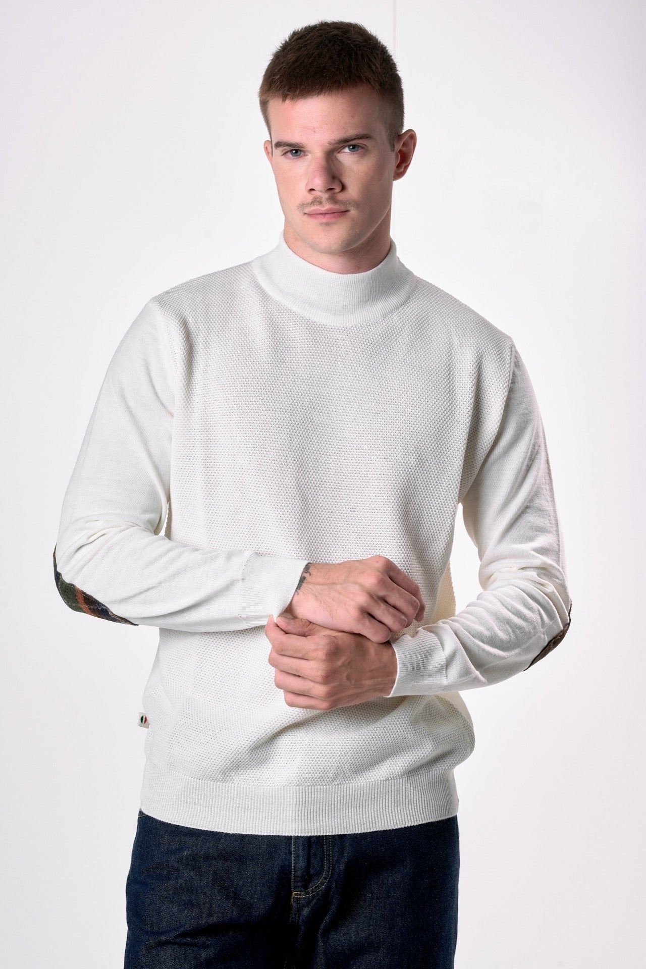 Rice-stitch merino wool turtleneck with V2 fabric patches. Its perfect fit and softness make it the perfect piece for any occasion, guaranteeing maximum comfort and a unique style.
