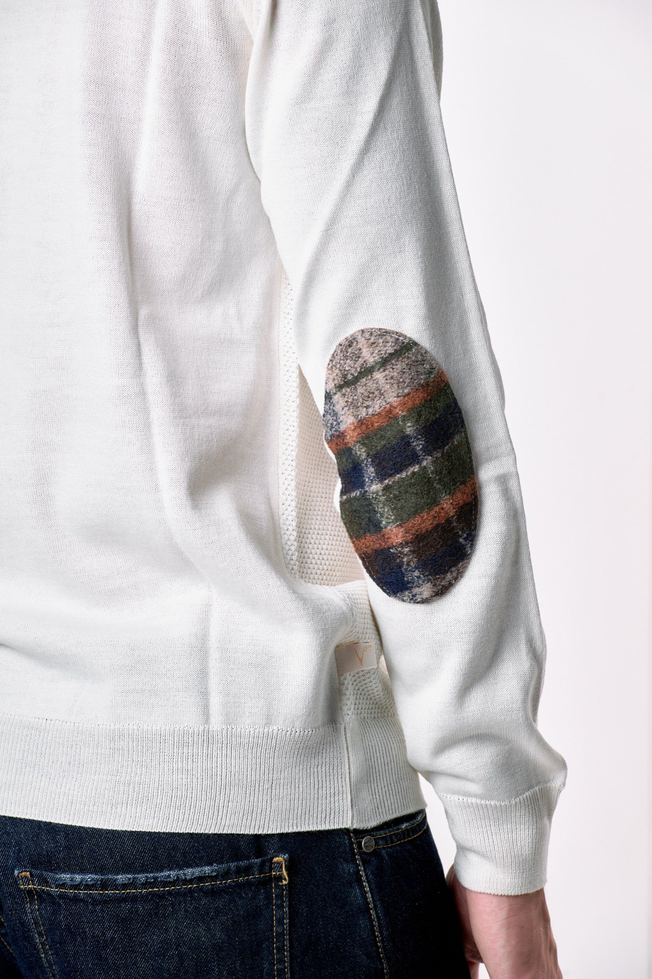 Cream merino wool turtleneck sweater with V2 fabric patches.