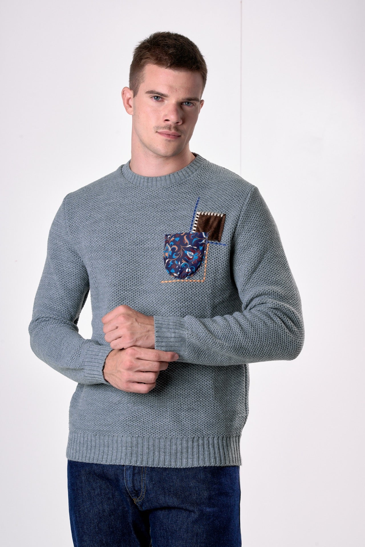 Grey Bird's Eye Crew Neck Sweater with Patchwork Pocket Embroidered with V2 Fabrics
