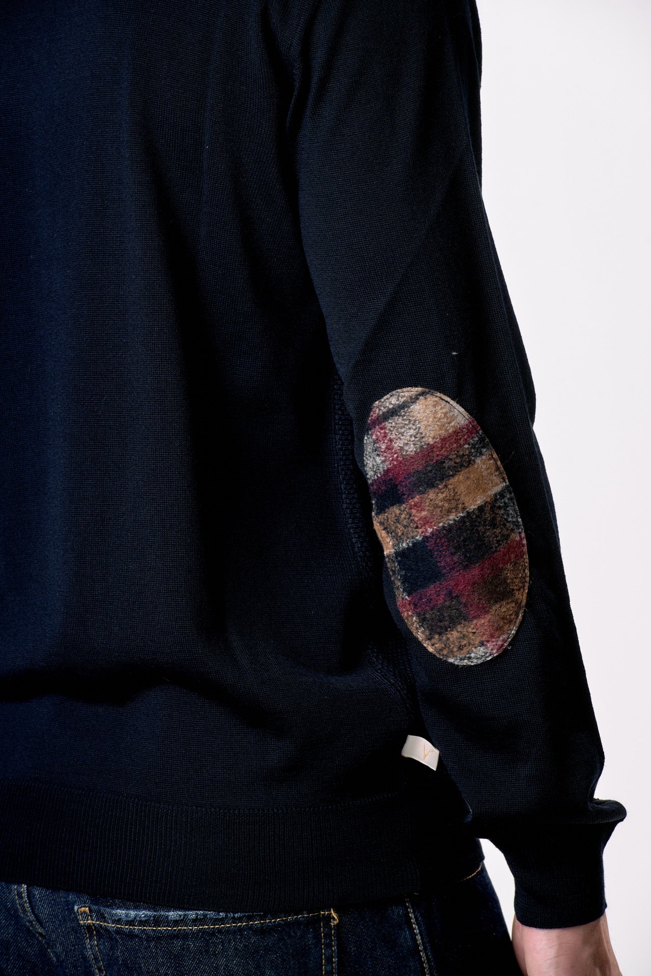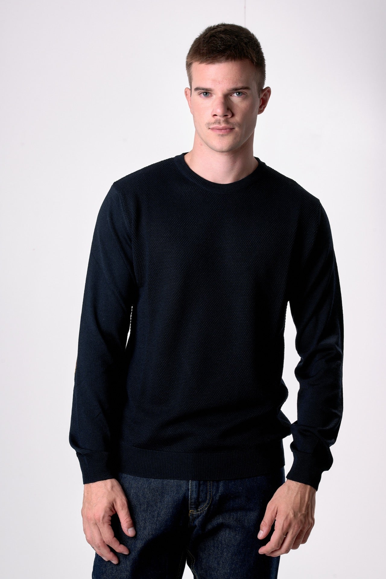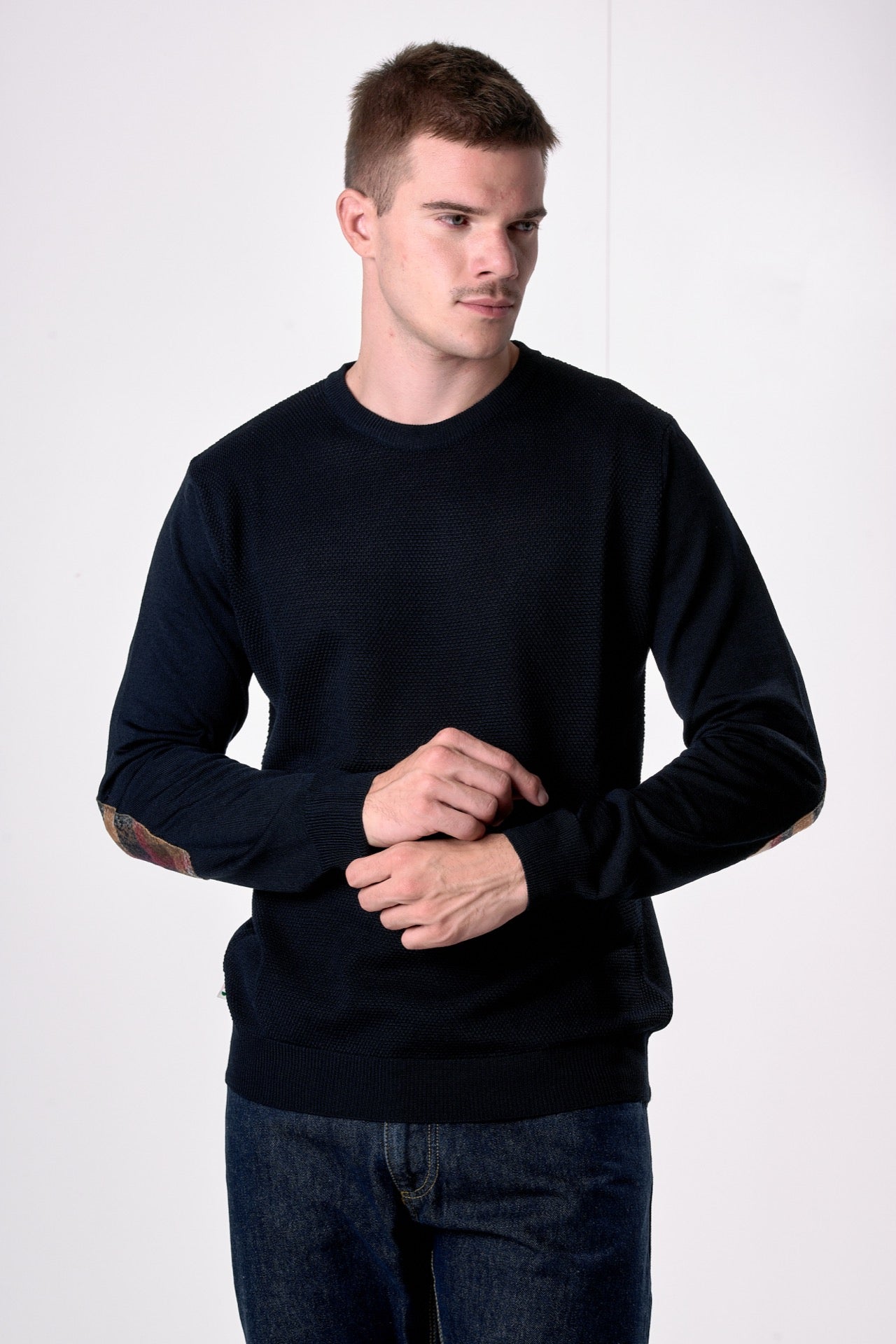 Merino Wool Crew Neck Sweater in Blue Rice Stitch with Fabric Patches V2