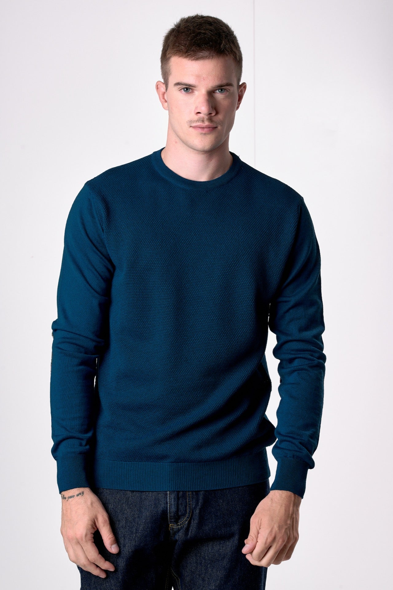 Rice stitch merino wool sweater with V2 fabric patches. The perfect fit and softness make it a versatile piece, guaranteeing maximum comfort and a unique style.