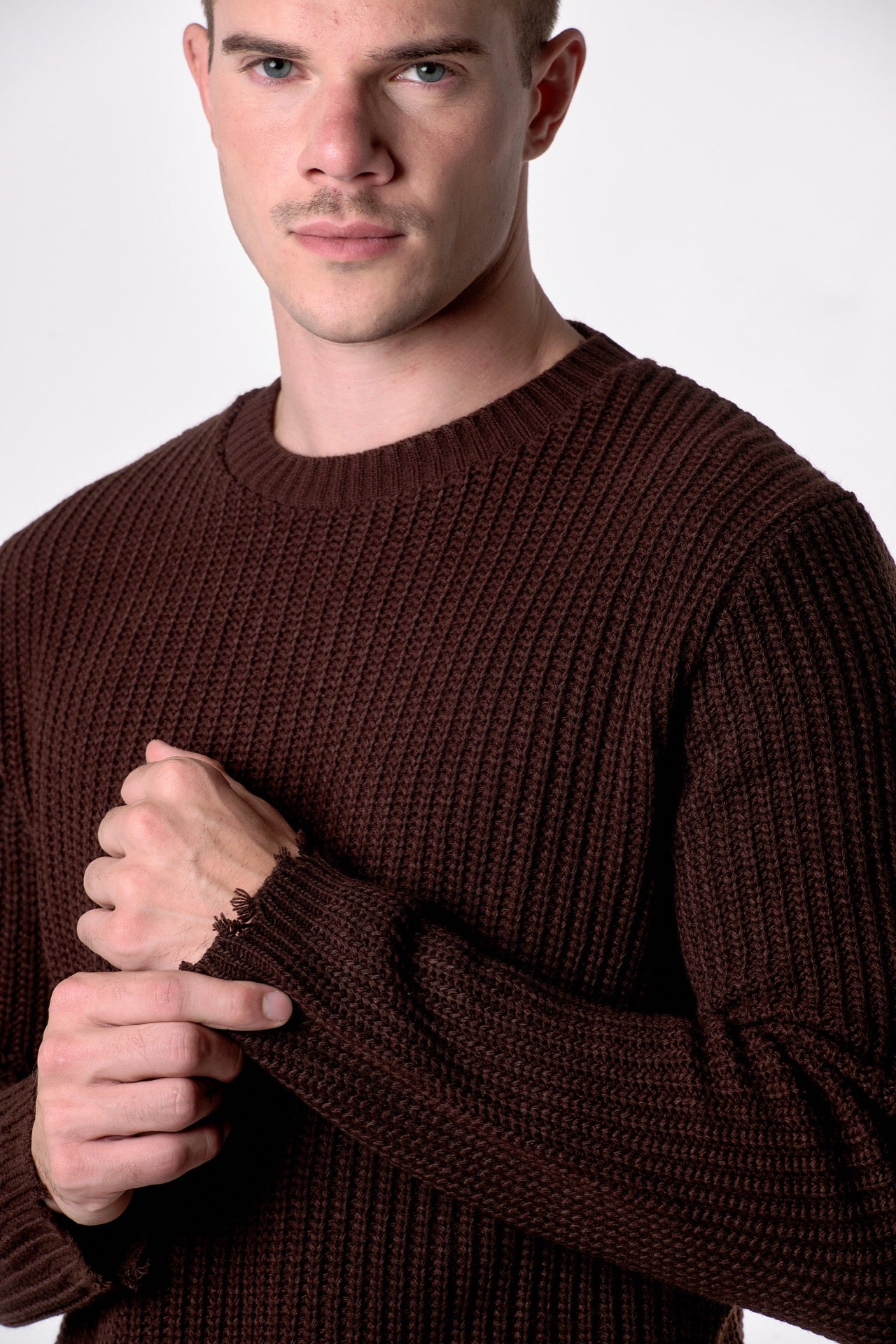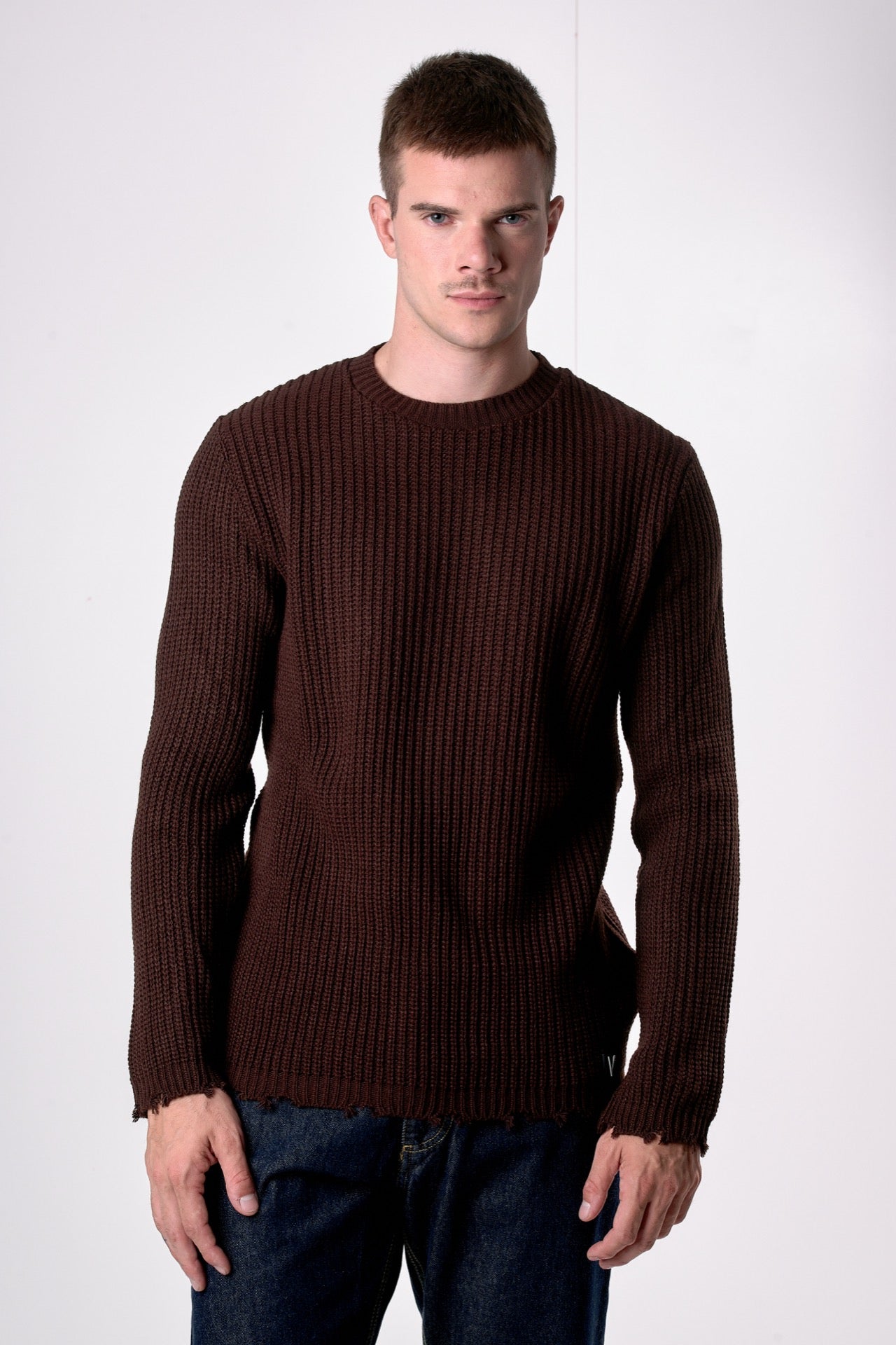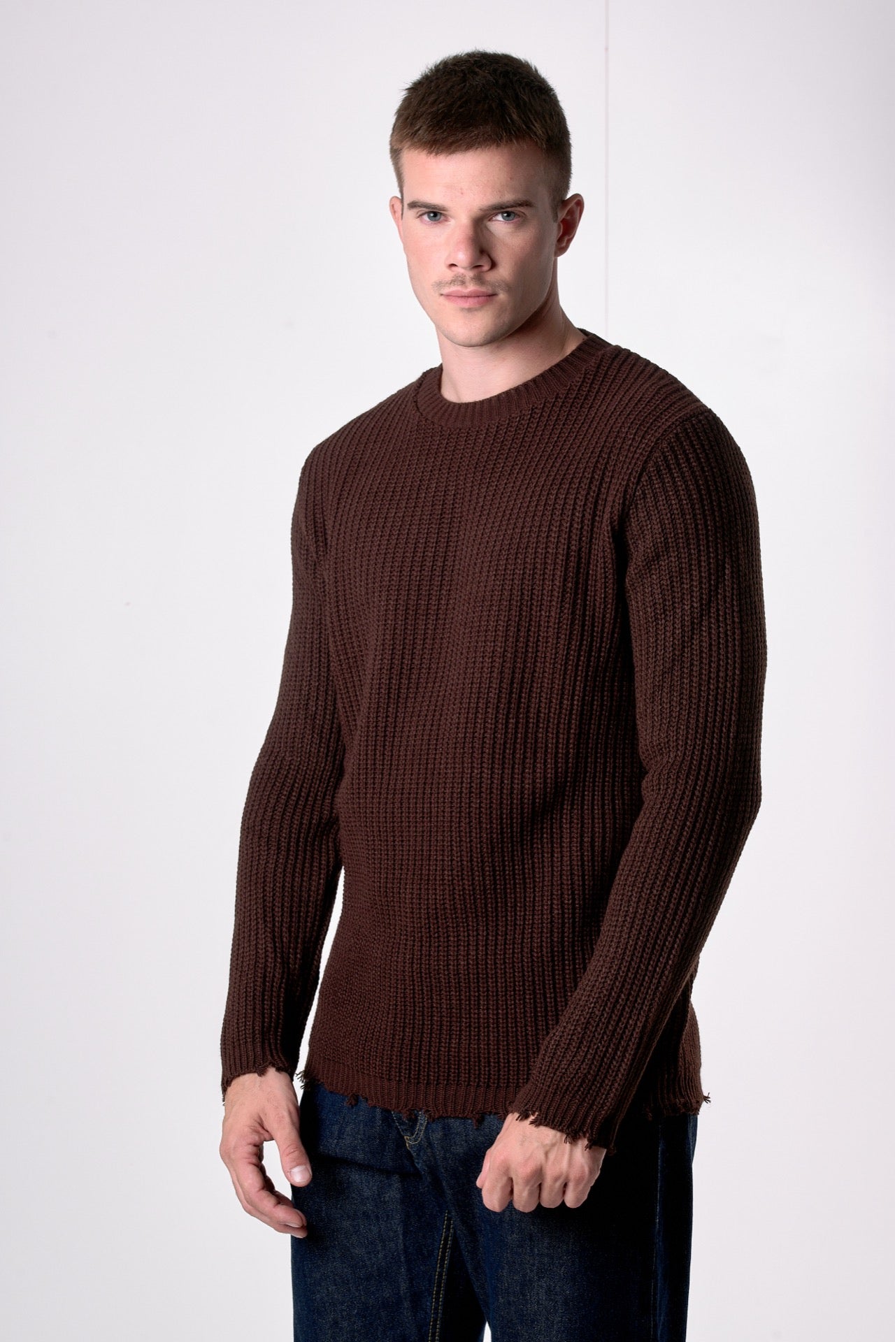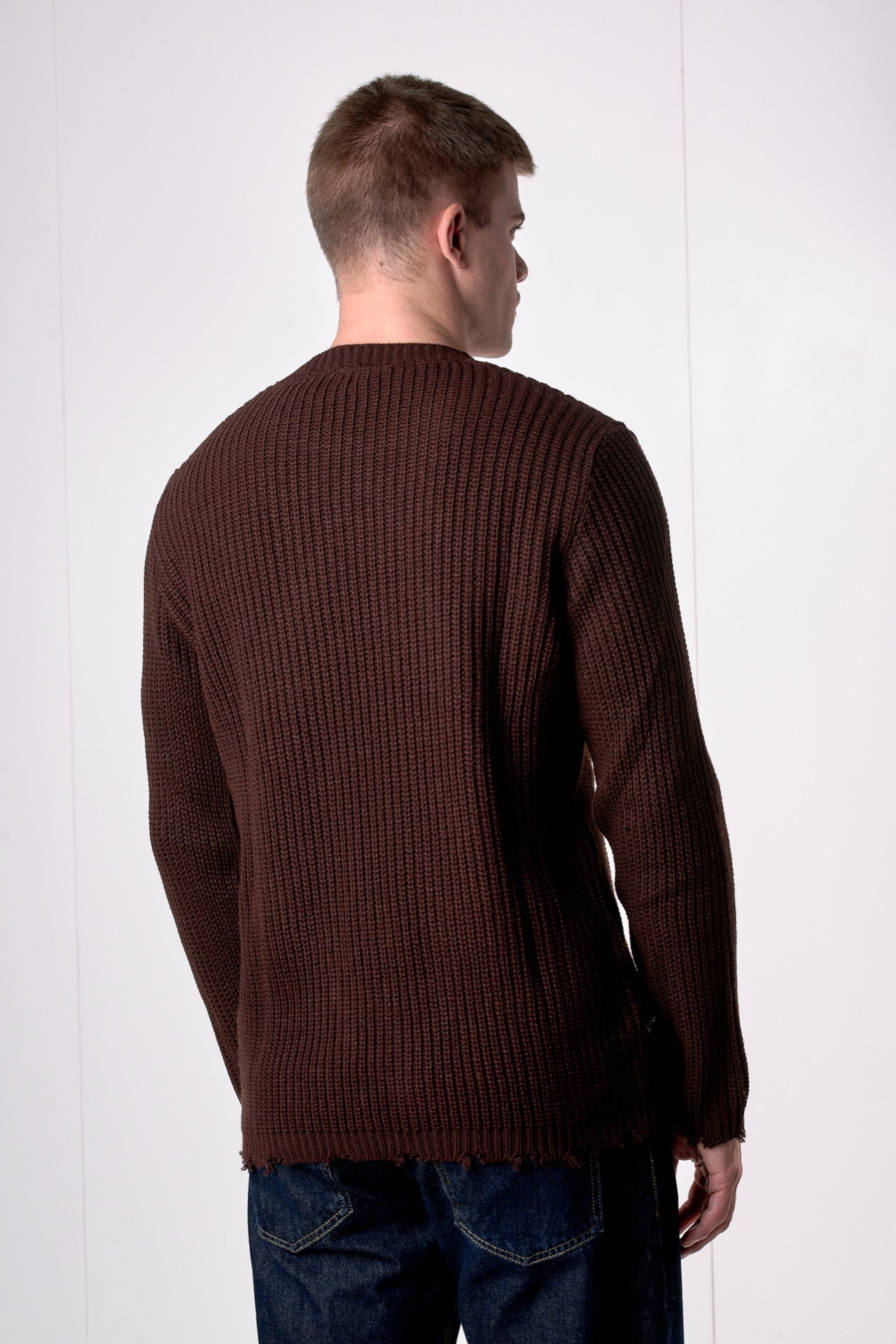 Crew Neck Sweater with Ripped Details in Dark Brown