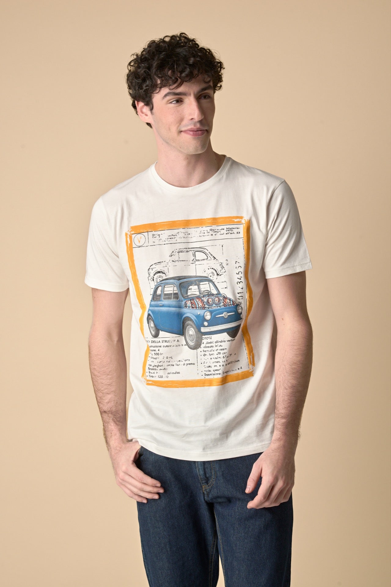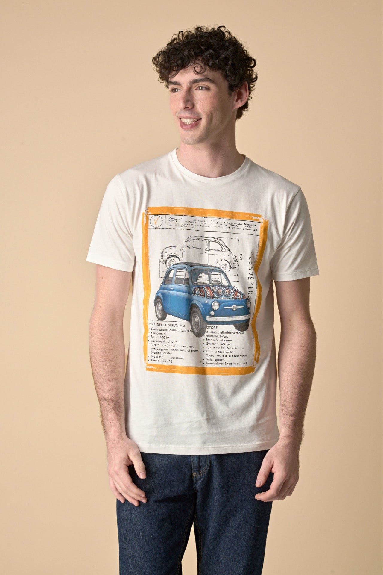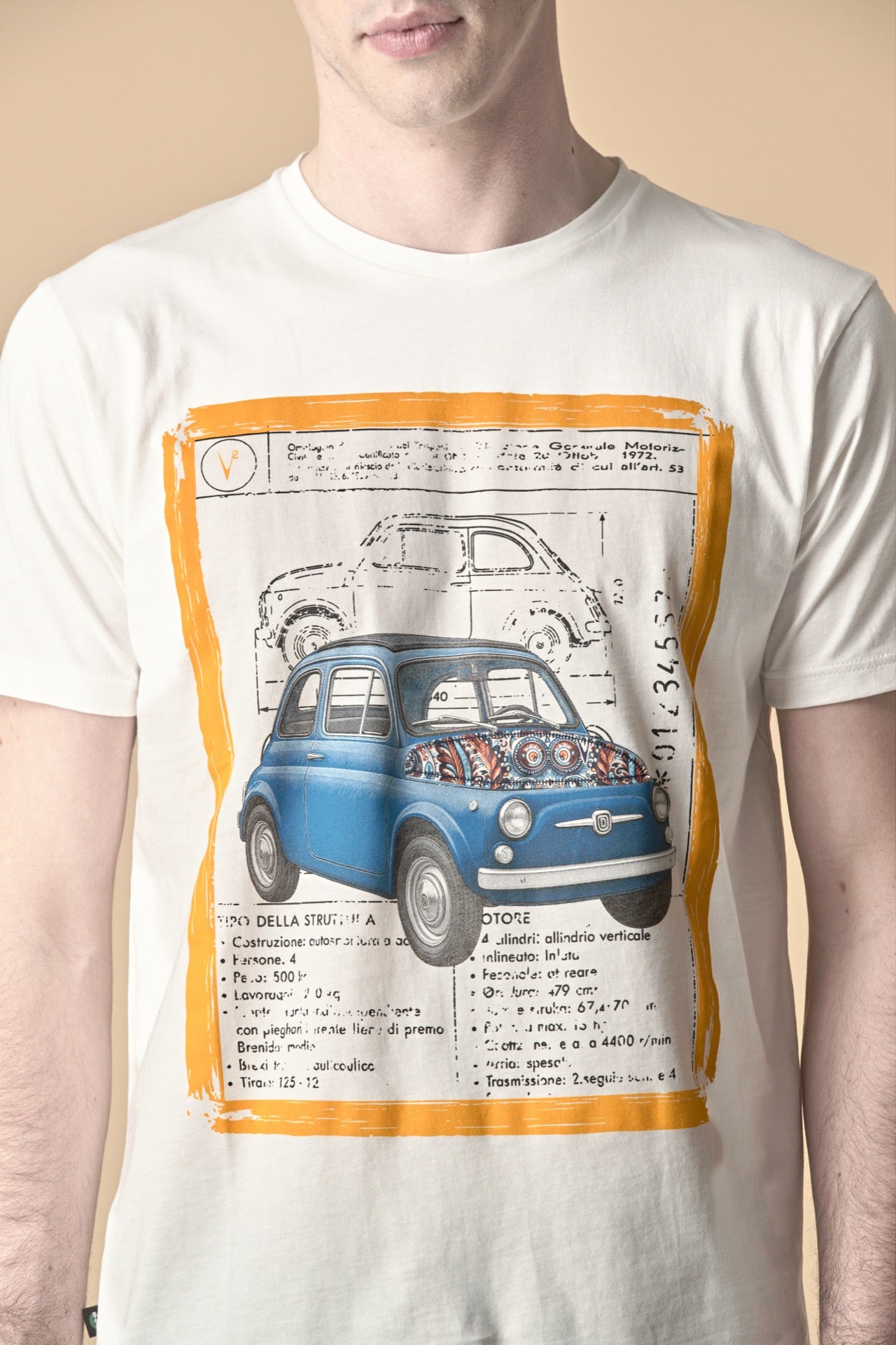 T-Shirt Panna stampa Macchina con inserto e interno collo in tessuto V2